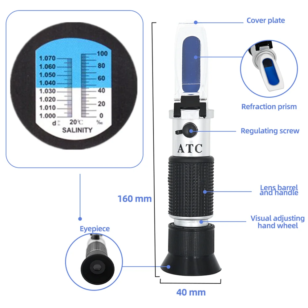 Этот оптический рефрактометр Brix & Salinity предназначен для измерения морской воды (морской Aquaris) или очень низких концентрированных растворов соли и низкой концентрации сахарных растворов, а также для чтения плотности раствора соли.
