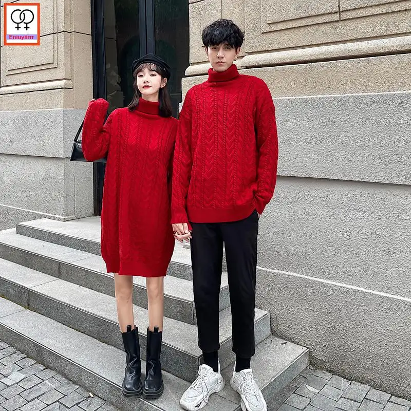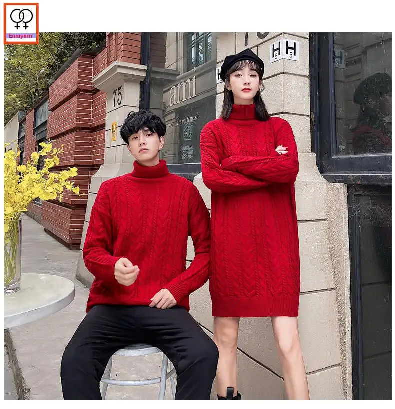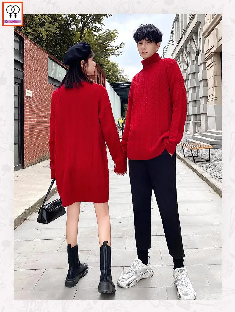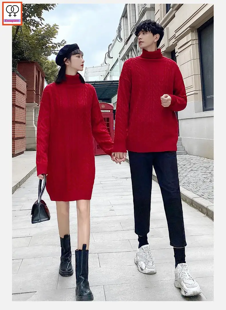 Одинаковая одежда для пар Женская, мужская, для рождественской вечеринки Святого Валентина Парень Девушка Повседневное свободное платье красный свитер с высоким, плотно облегающим шею воротником