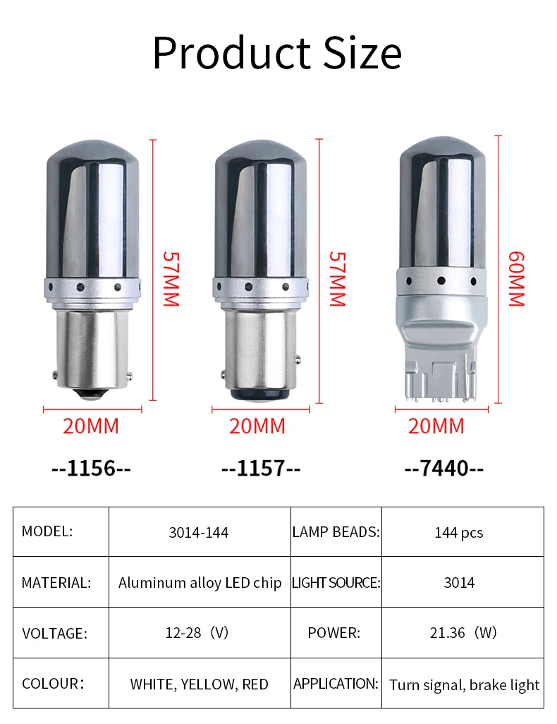 Особенности:Совершенно новый, хорошее качество и простая установкаС металлическим корпусом, что делает работу ламп с низким нагревом.Высокая теплопроводность, алюминиевый сплав и изысканная эстетика Спецификация:Состояние на 100% абсолютно новыйГнездо: 1156 1157 7440 7443Материал: ПВХНапряжение: 12-28 вМощность: 21,36 ВтТип: светодиодныйМодель: 3014-144Светильник: белый, красный, желтый Посылка включает в себя:1 * сигнал поворота светильник лампочка