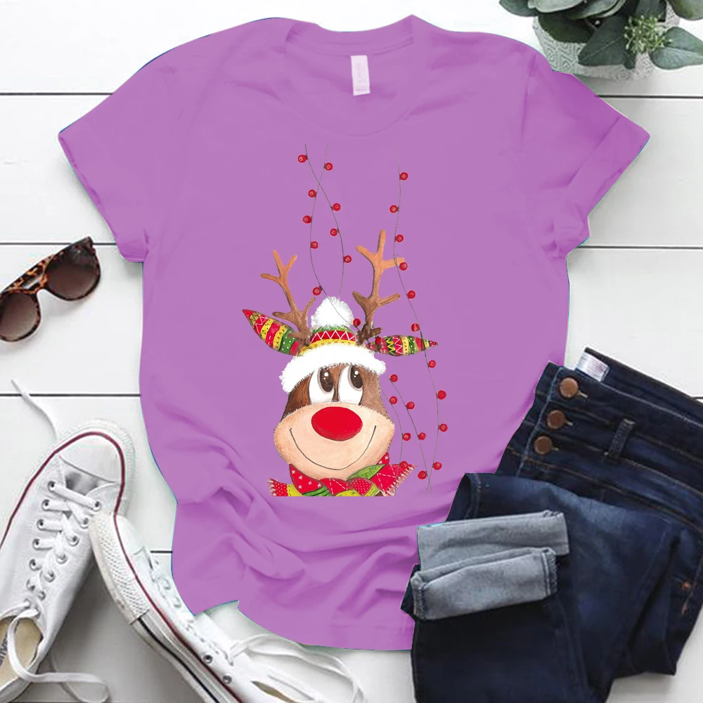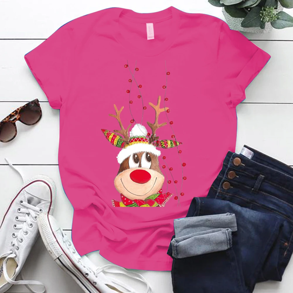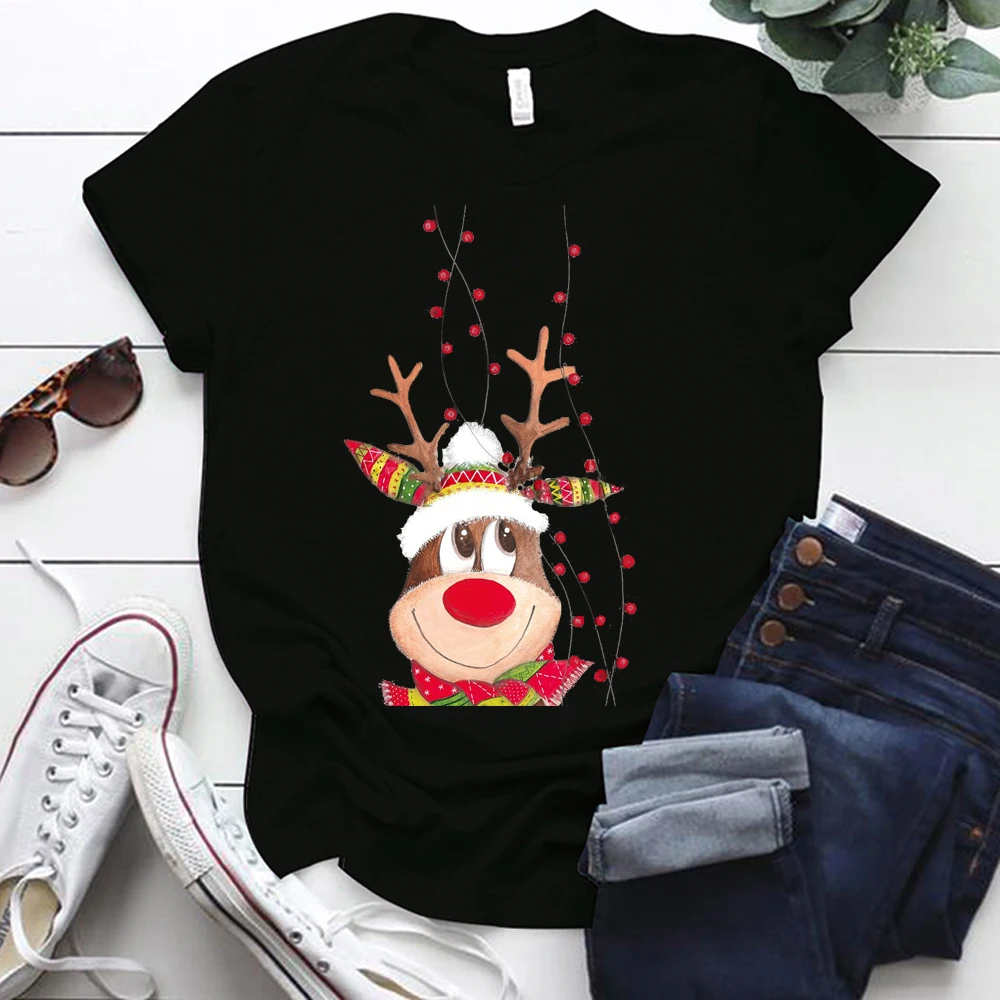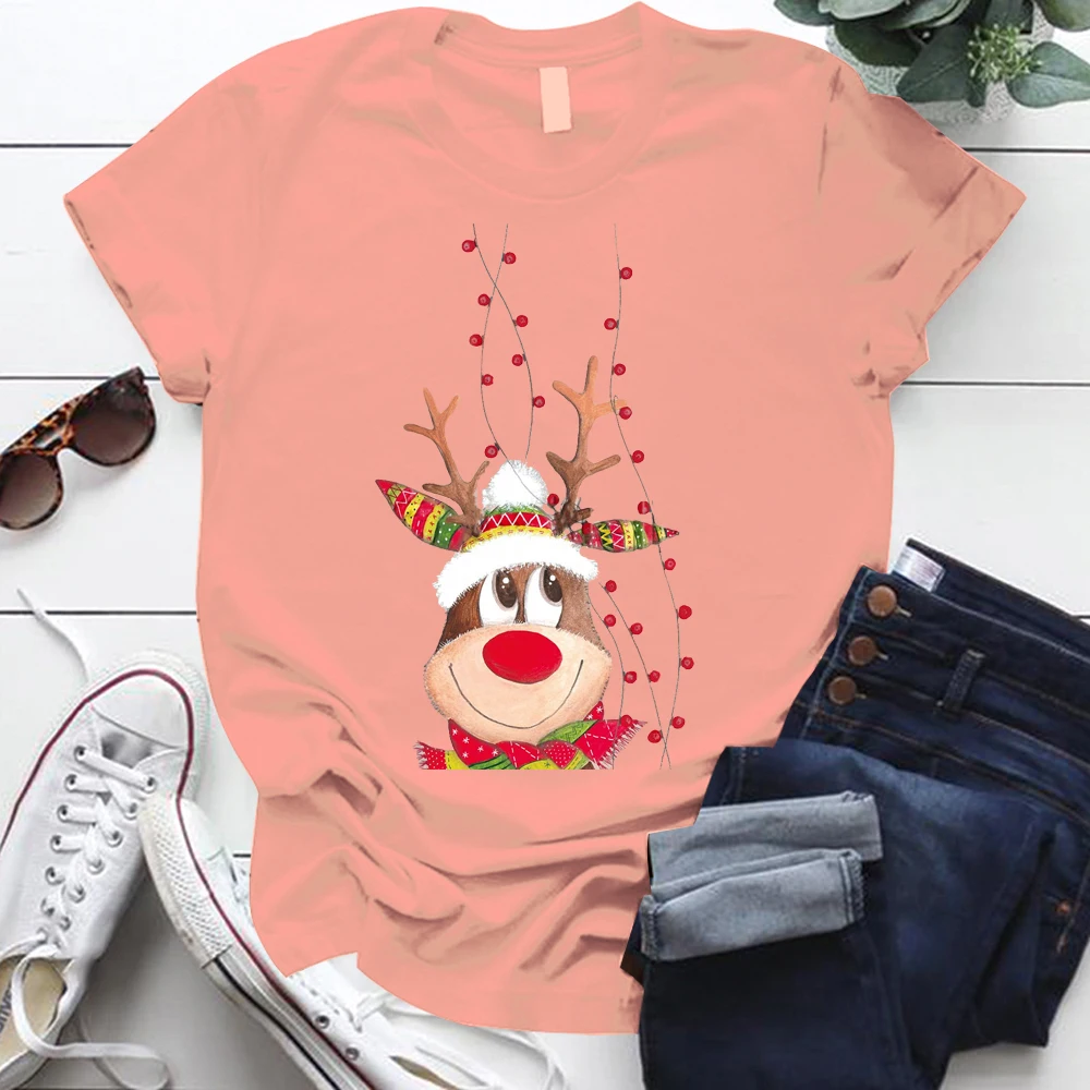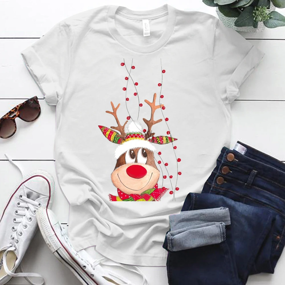 Забавные милые Рождественская, Печать оленей эстетические женские футболки Топы с коротким рукавом с круглым вырезом Футболка оверсайз праздник Ropa De Mujer 2020