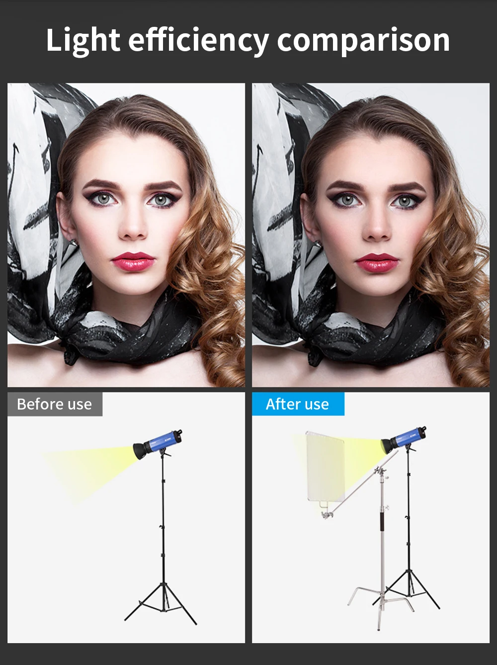 Широкое применение: идеально подходит для полнотелых портретов, больших фотографий для внутреннего и наружного использованияСъемная конструкция: легко собрать с магнитной адсорбцией. Удобно хранить и переносить5 видов цветов-белый: мягкий, нейтральный, чистый свет. Серебро: холодный и яркий эффект, увеличивающий изюминку. Золото: теплое, здоровое освещение. Черный: блокирует рассеянный свет. Диффузор (полупрозрачный): смягчает прямой светВысокое качество-изготовлено из высококачественной ткани, не выцветает, мягкое отражение. Двухслойная кромка повышает долговечность. Металлическая конструкция для длительного использованияОтличный эффект: отражатели 4 в 1 подходят для всех источников света (дневной свет, вольфрам, вспышка и т. д.), обеспечивая мягкий отраженный светЧерная светопоглощающая ткань: с особенностями высокой плотности и светостойкости, она подходит для винных бутылок, съемки ювелирных изделий.
