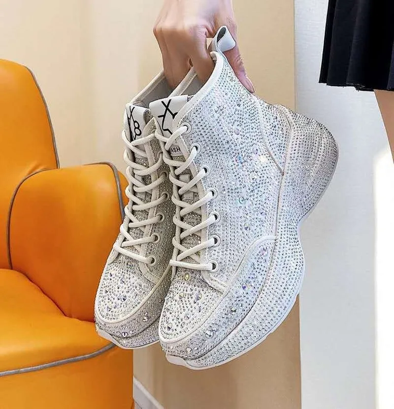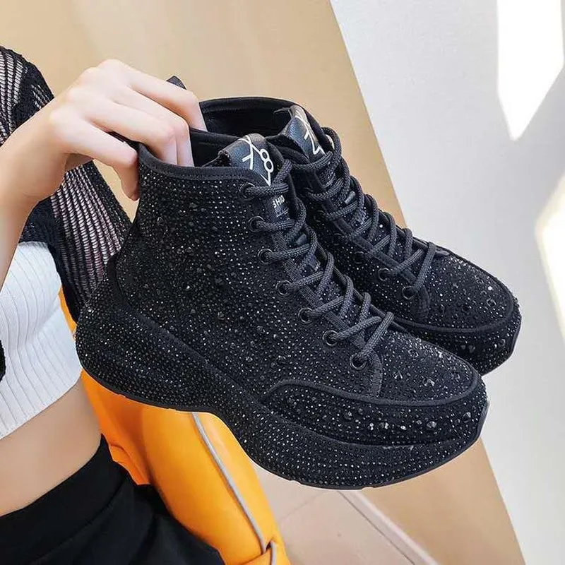 Женские ботинки из воловьей кожи, высокие кроссовки со стразами, на толстой подошве, спортивная обувь на платформе с высокой талией, Осень-зима