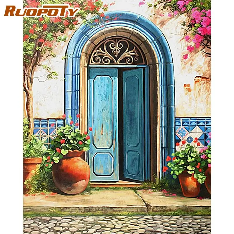 RUOPOTY картина маслом по номерам для взрослых и детей ручная работа Diy подарок синяя дверь пейзаж картина по номеру для домашнего декора стен