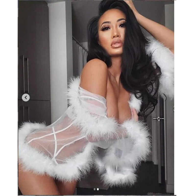 Сексуальное женское сексуальное Сетчатое женское белье Прозрачное длинное платье с расклешенными рукавами и перьями ночной халат Ночное Платье Эротическое