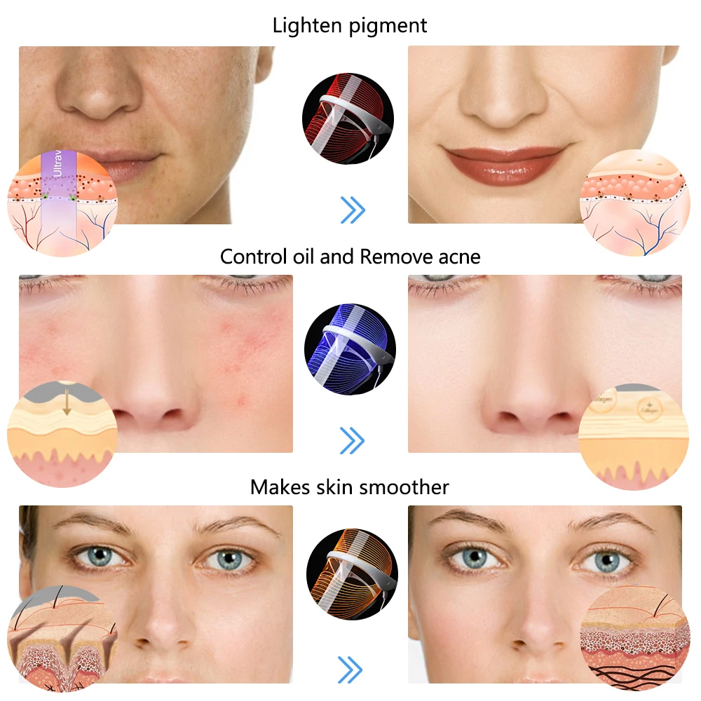 1. Красный светильник: 620 ~ 750 нм. Повышает эластичность кожи и улучшает метаболизм. 2. Синий светильник: 470 ~ 495нм. Ингибирует секрецию масла, предотвращает акне и уменьшает скарлы. 3. Желтый светильник: 590 ~ 620nm. Восстанавливает тусклую кожу и нежную кожу.