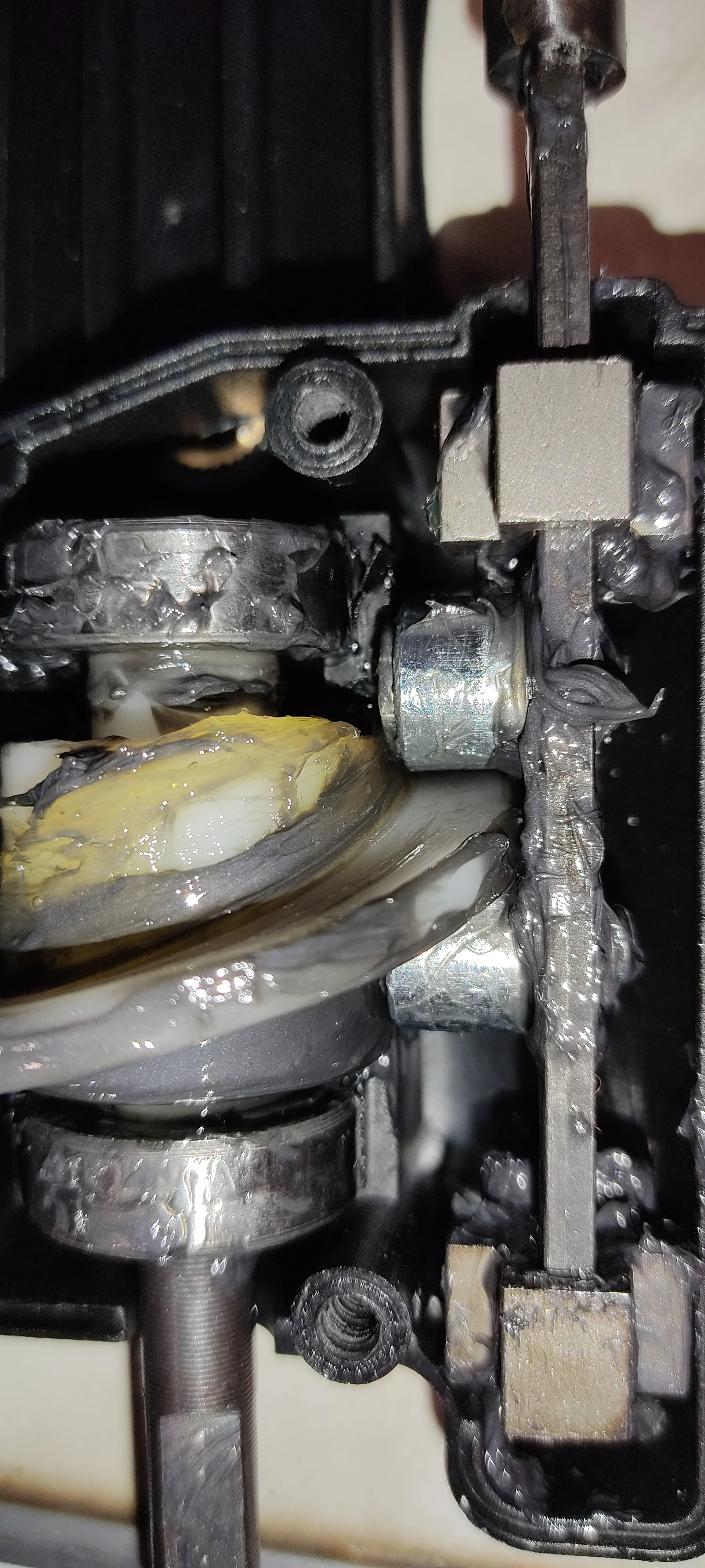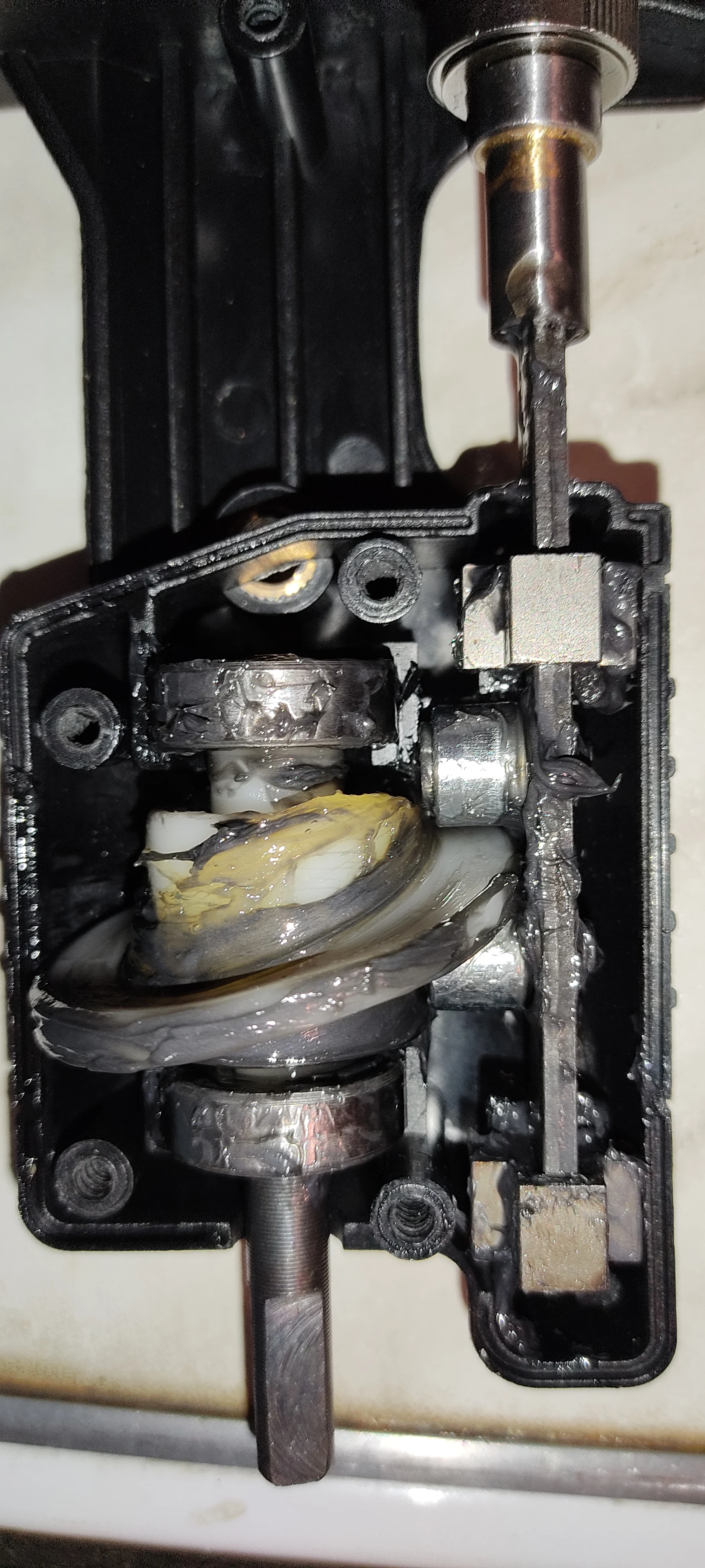 Представленный в описании способ преобразования крутящего момента в возвратно-поступательное движение не соответствует действительности. Способ передачи другой, узел выполнен из пластиковой детали. Вопрос долговечности под большим вопросом. Выбирал исходя из описания. Знал бы, что будет так сделано, не взял бы на за что. Смазки было мало. Некоторые детали вообще без смазки. На фото - уже после самостоятельного внесения смазки.