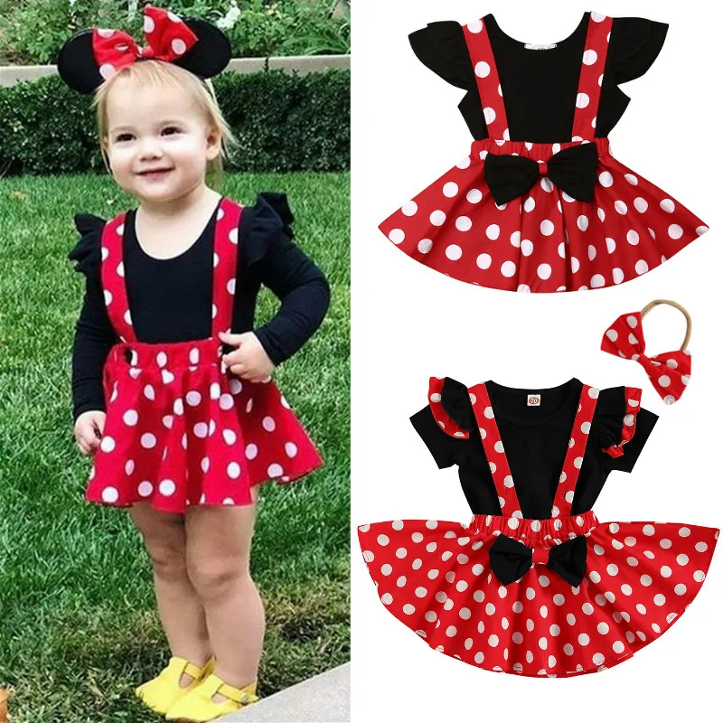 2021 летний комплект одежды для маленьких девочек с короткими рукавами, футболки для малышей, футболка с оборкой топ + подтяжки в горошек юбки на каждый день комплект детской одежды От 0 до 3 лет