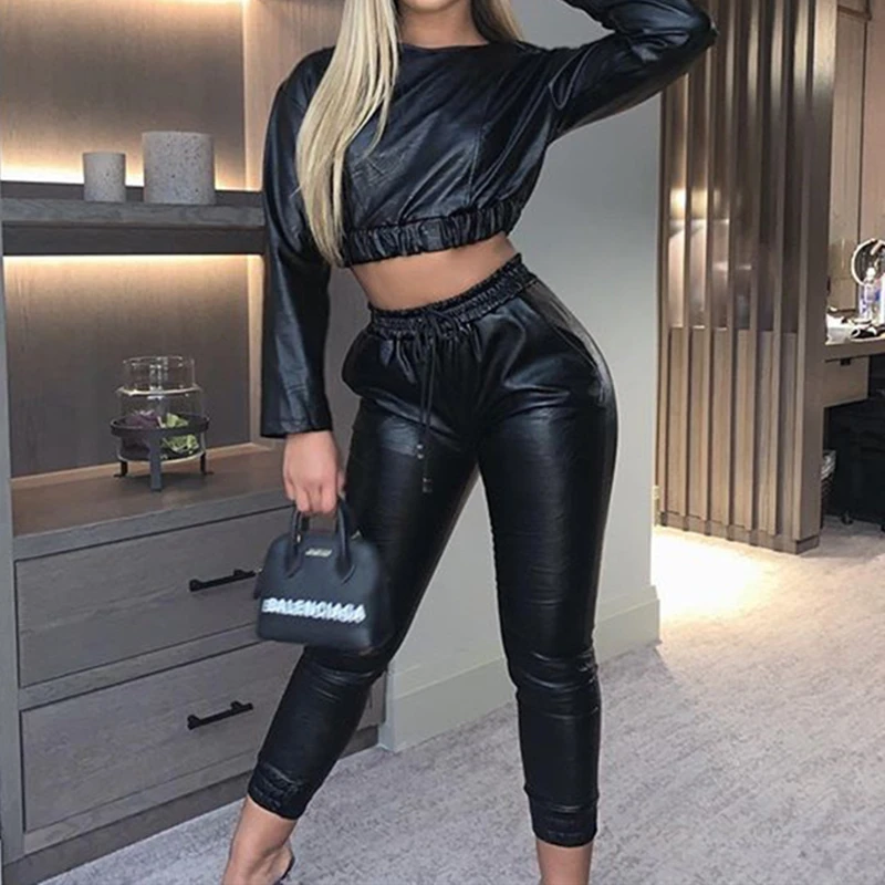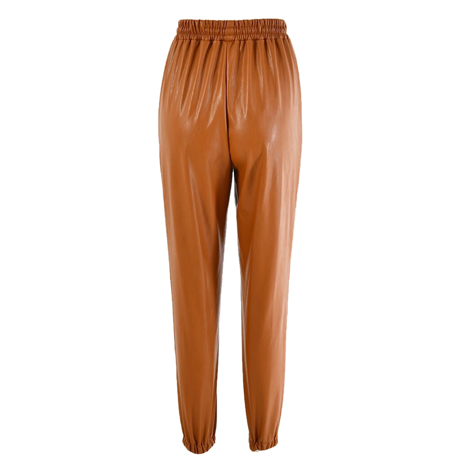 Женские кожаные спортивные брюки, повседневные однотонные зауженные брюки с высокой талией и завязками с карманами