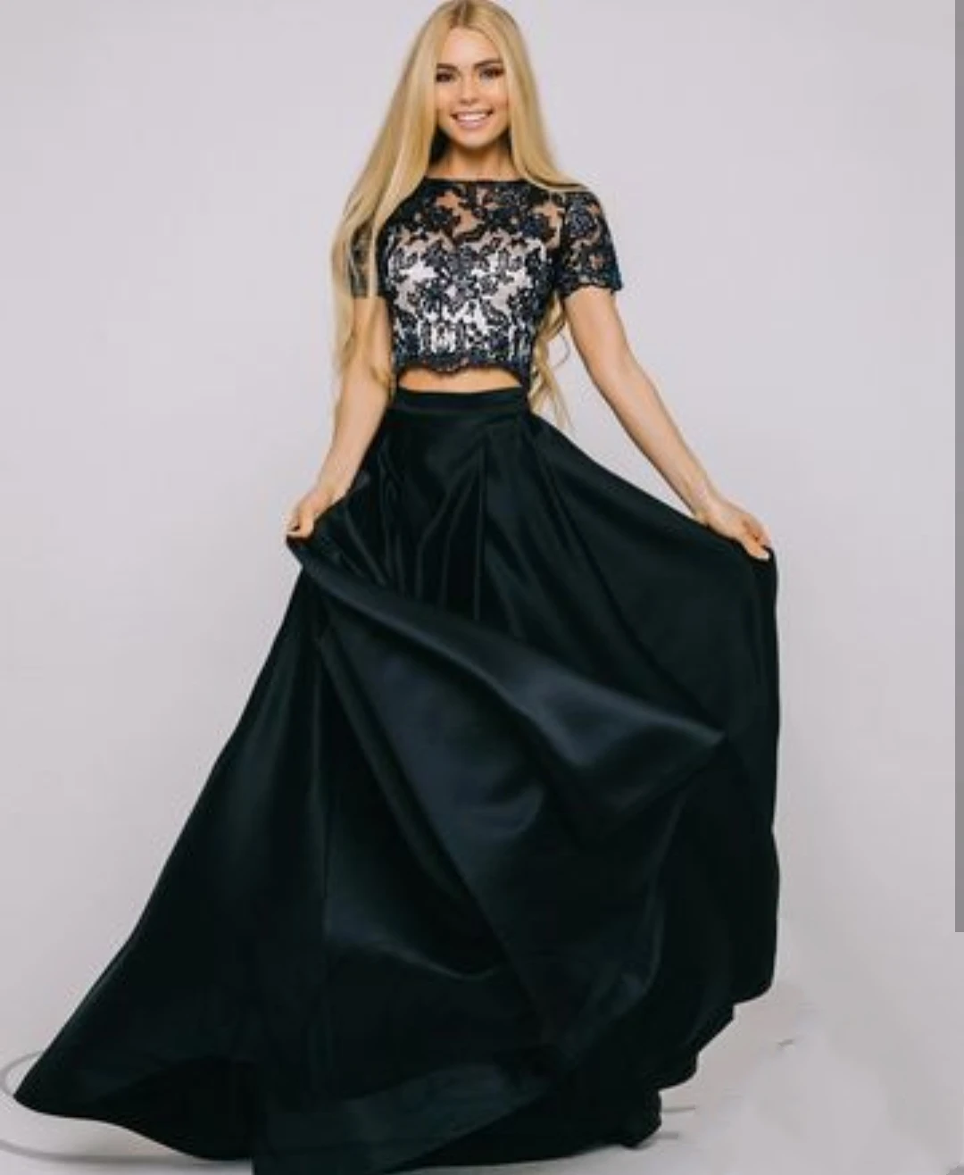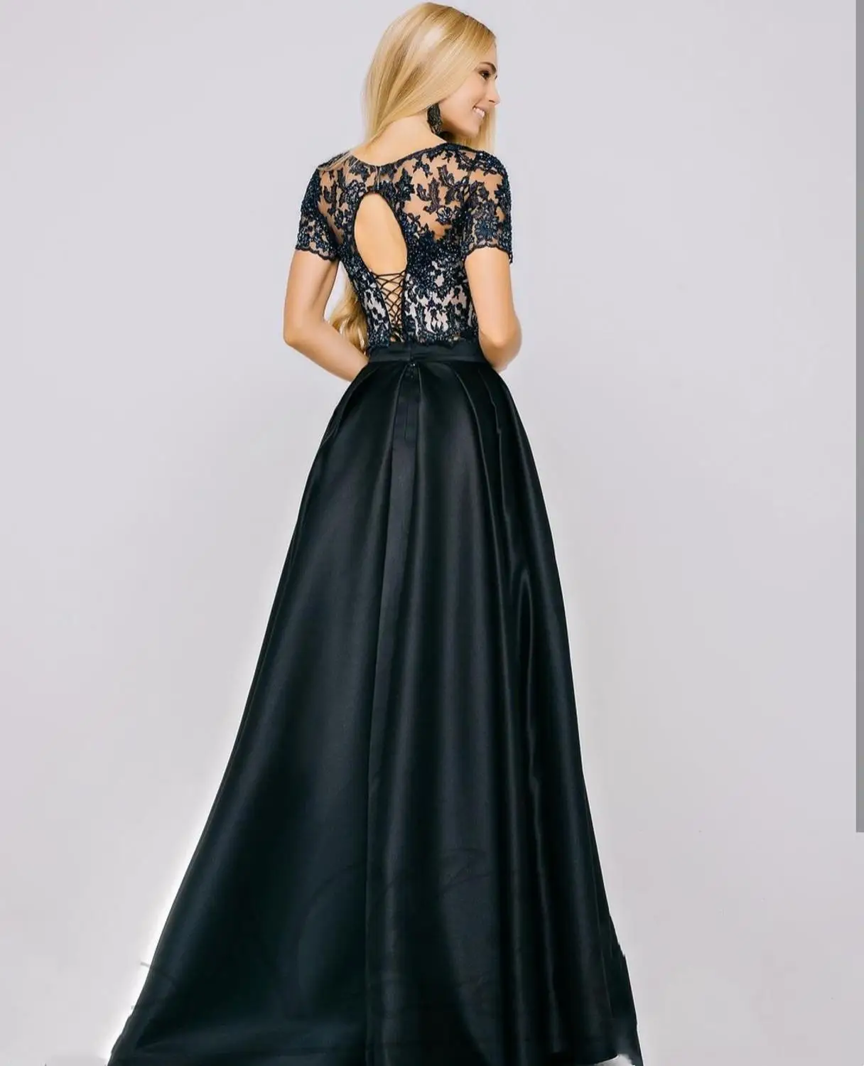 Длинное вечернее платье из двух частей, платье для выпускного вечера с коротким рукавом и кружевной аппликацией, Женские официальные платья, Черный Великолепный кружевной топ, атласная юбка