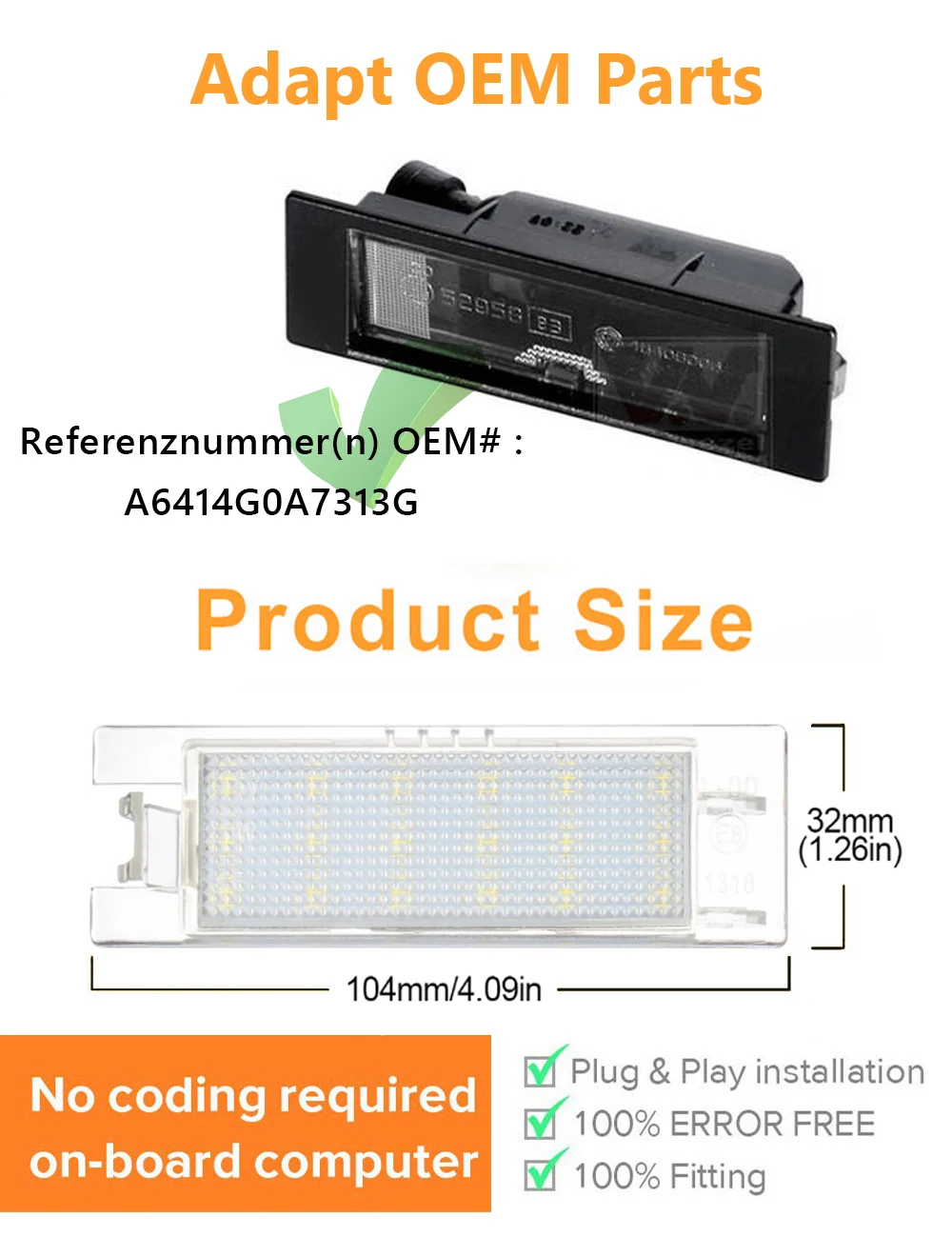 1.100% новый бренд2. Тип: лампа номерного знака3. Цвет: белый 6000K4. Количество светодиодный: 18SMD5. Вольт: 12 В постоянного тока6. Материал покрытия: пластик7,2 штук (пара) 3 высокой мощности SMD светодиодный номерной знак светильник Светодиодные лампы.8. Встроенный контроллер Canbus, не будет генерировать сообщения об ошибках9. Безошибочный дизайн, прямая замена, простая установка подключи и играй10.Referenznummer(n) OEM #:A6414G0A7313G