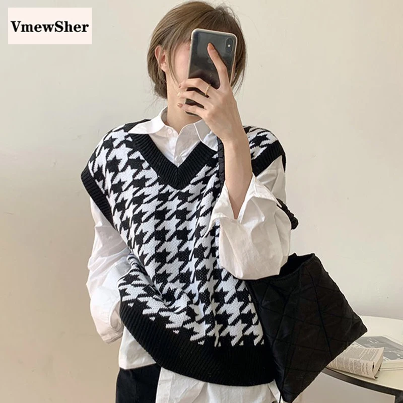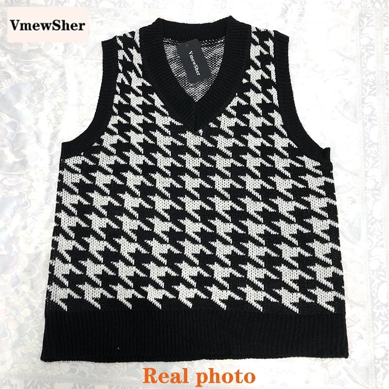 Женский клетчатый свитер-жилет VmewSher, Модный пуловер в стиле гусиные лапки с V-образным вырезом, вязаный жилет без рукавов в стиле преппи на осень и весну