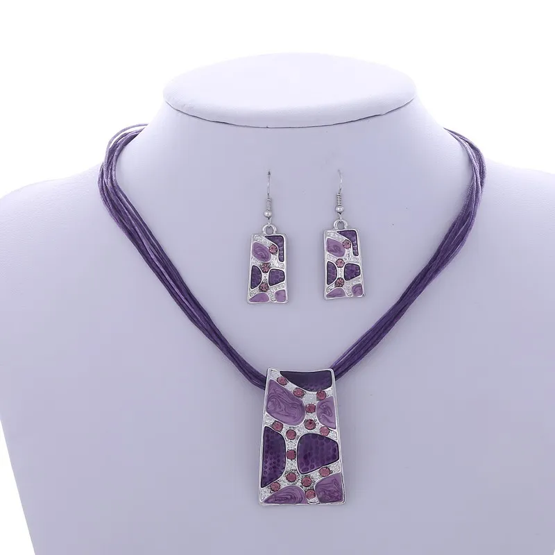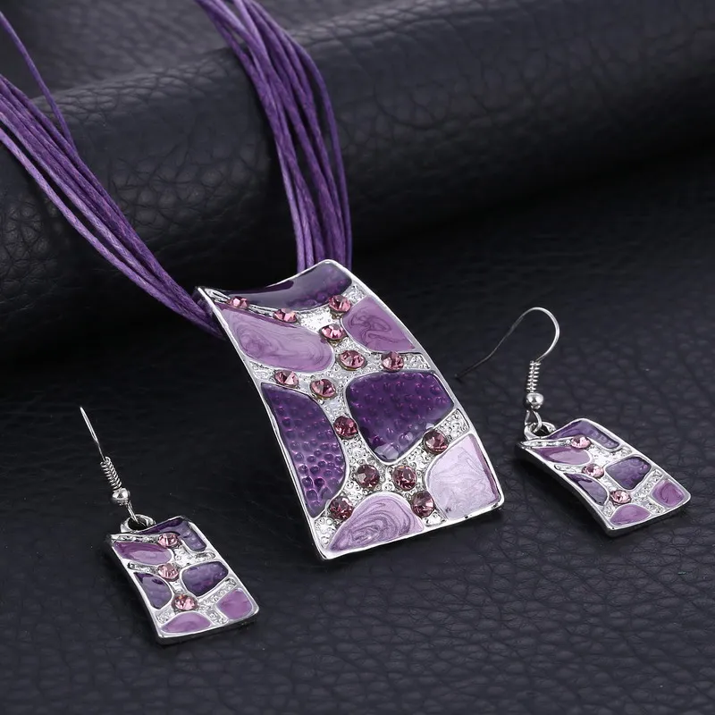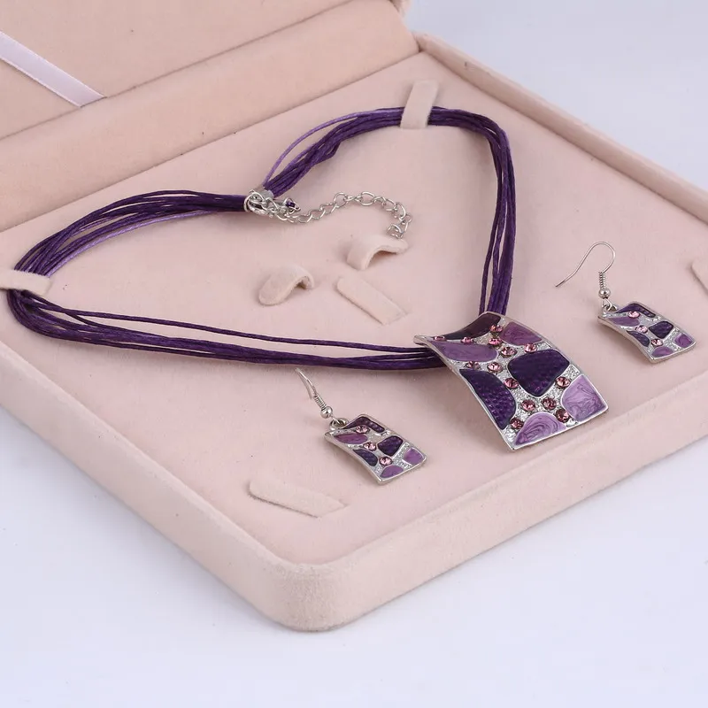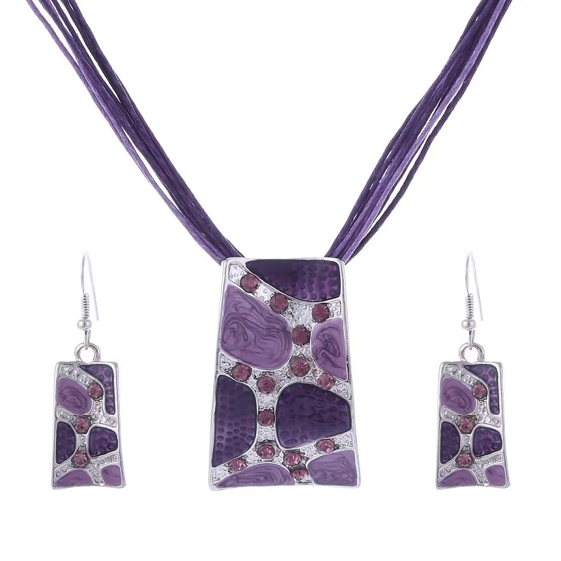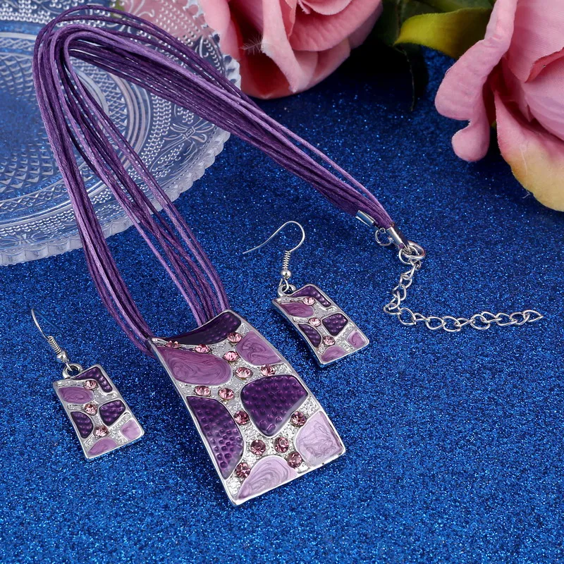 Геометрическим фиолетовым Ожерелье Серьги Комплекты Многослойные на вощеном шнуре из колье ожерелье эмалированное класса люкс из металла с украшением в виде кристаллов Свадебные комплект ювелирных изделий