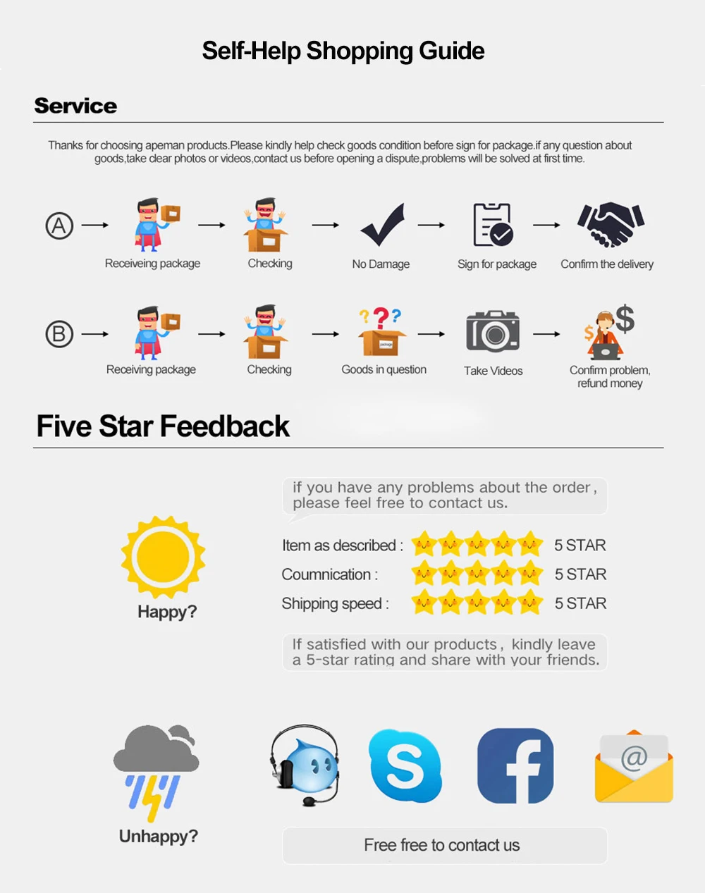 1. Полный возврат средств или повторная отправка, если вы не получили свой заказ.2. Полный или частичный возврат средств, если товар не соответствует описанию.