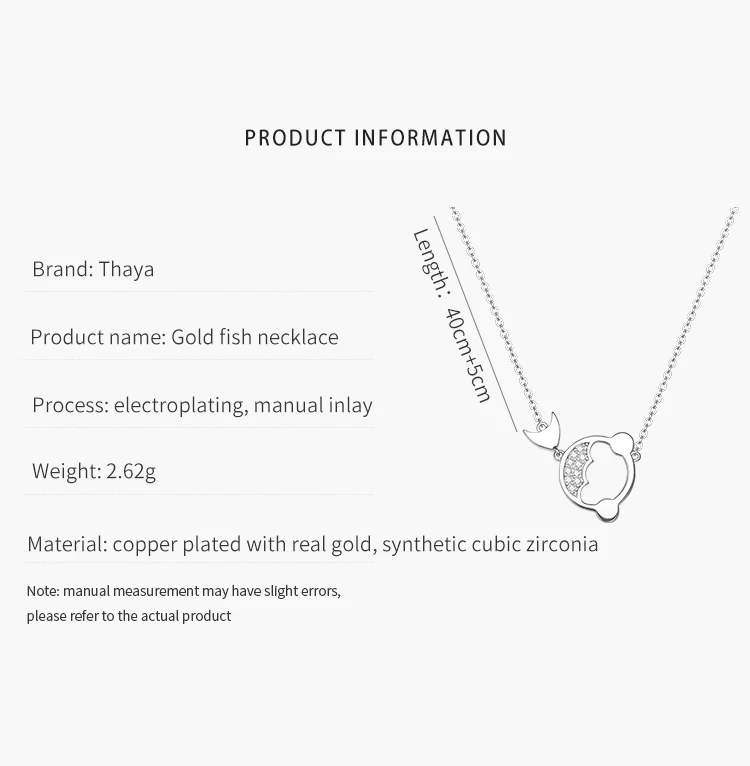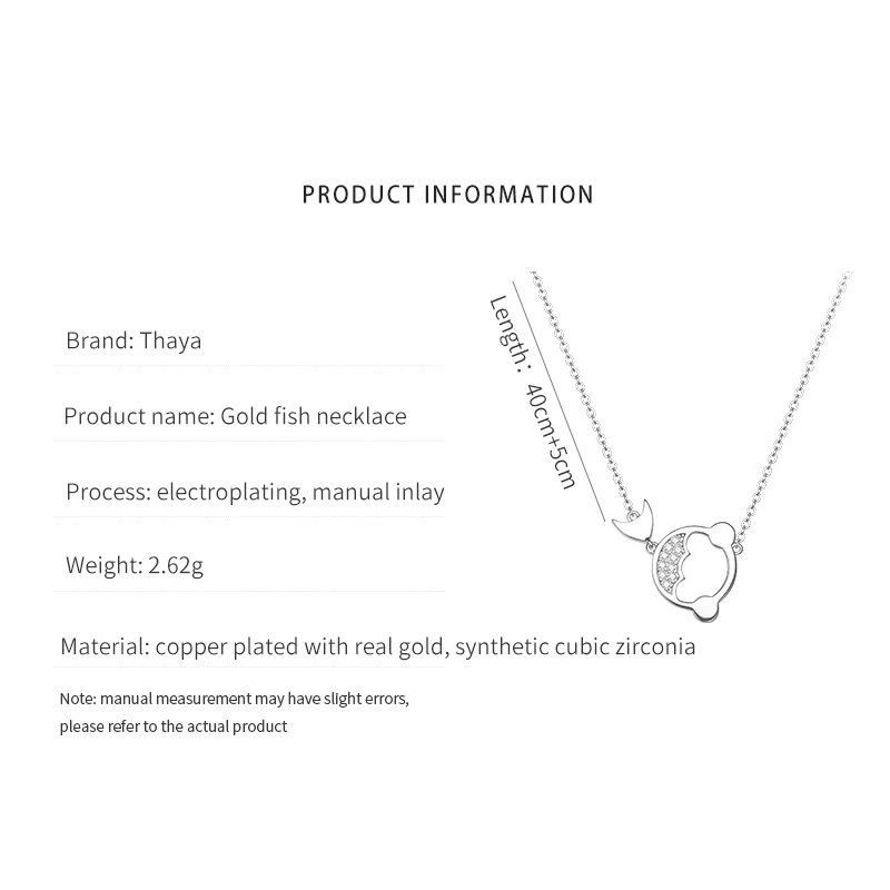 Бренд: Thaya Название продукта: ожерелье с рыбкой Материал: медь покрыта настоящим золотом, синтетический фианит Процесс: Гальваническое покрытие, Ручная инкрустация Вес: 2,62 г Длина: 40 см + 5 см Примечание: ручные измерения могут иметь небольшие погрешности, пожалуйста, обратитесь к фактическому продукту