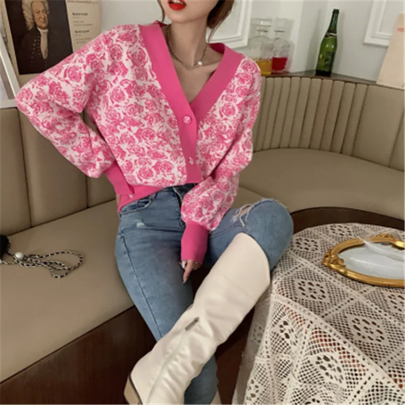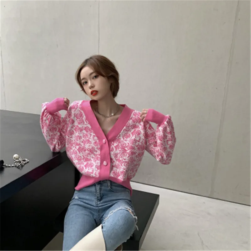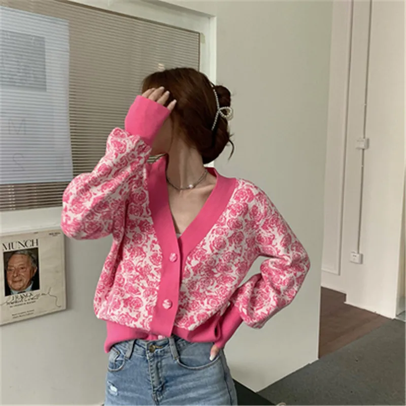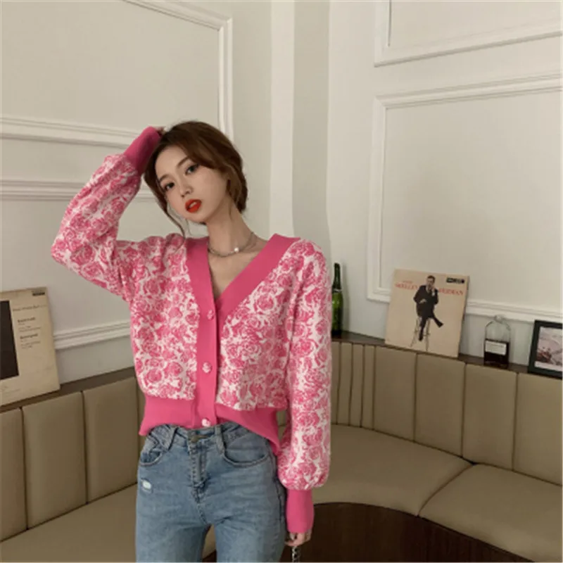 Сладкий Casuasl свитер 2020 корейский Стиль шикарный v-образным вырезом хит Цвет Роза, Вязанная одежда, длинный рукав, короткий Carigans женский женская зимняя одежда