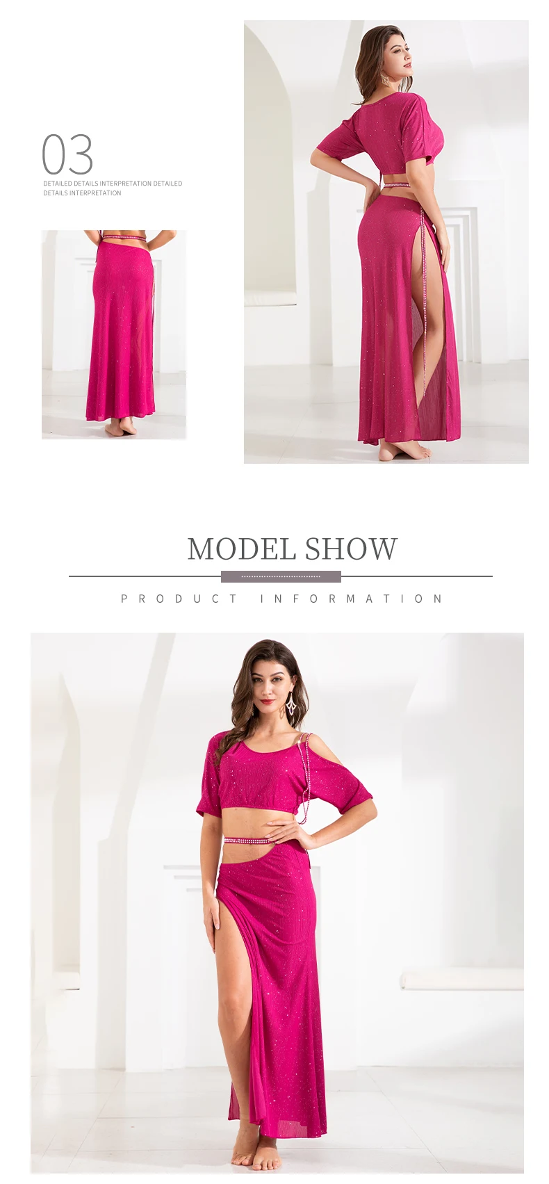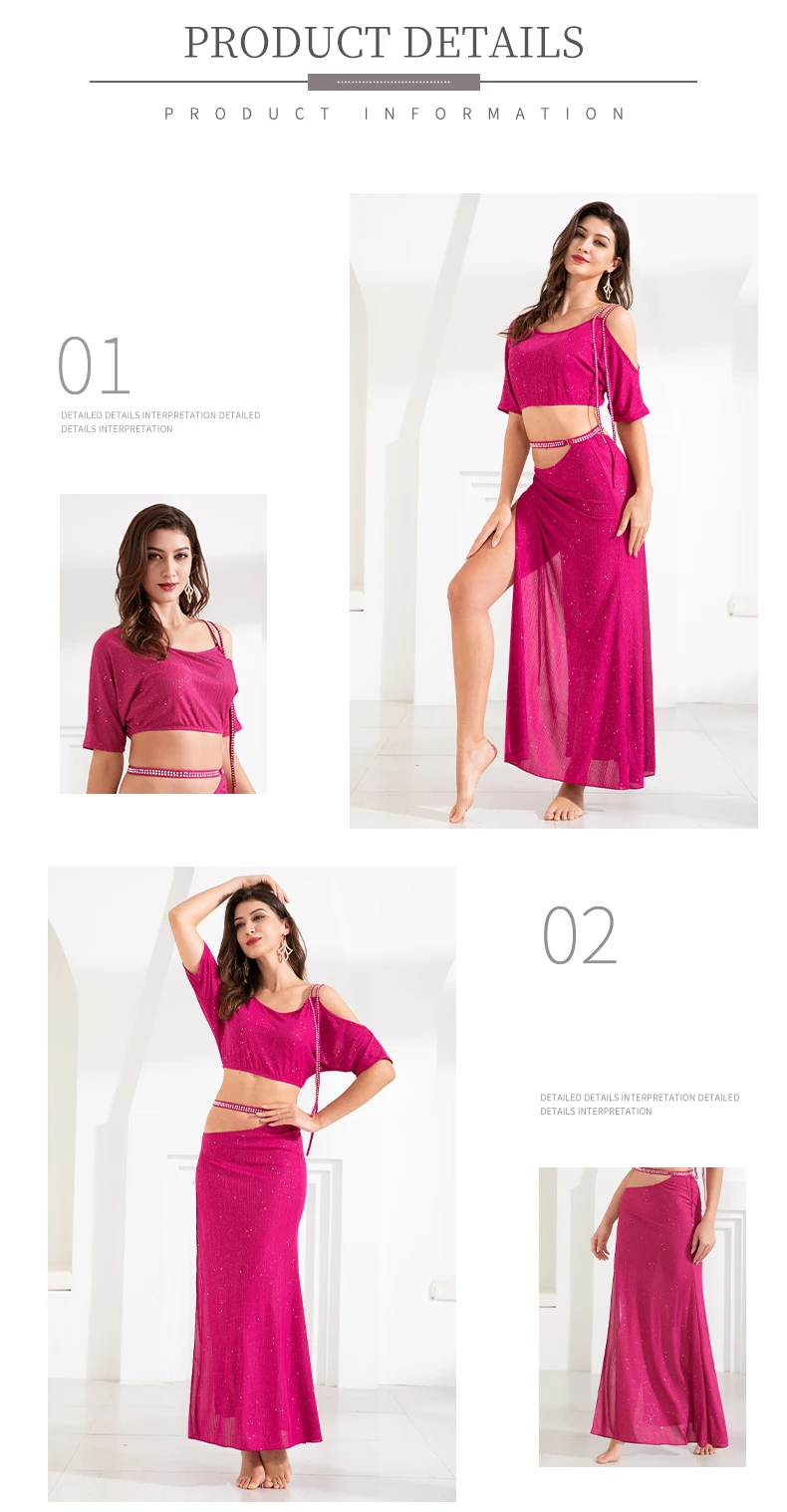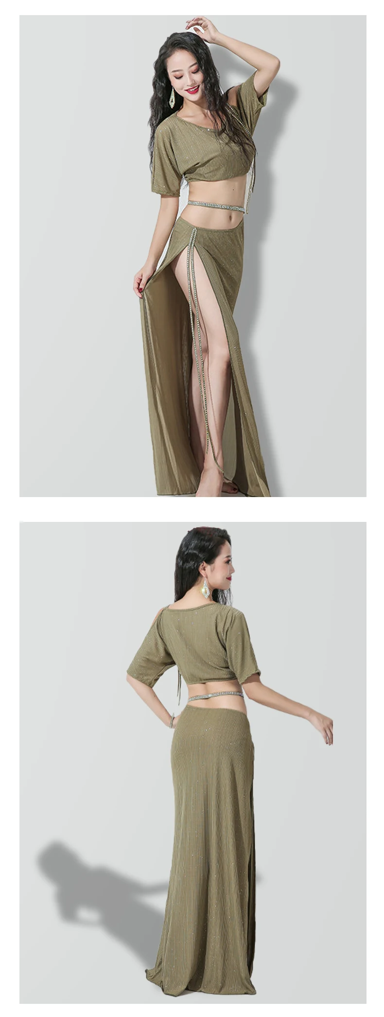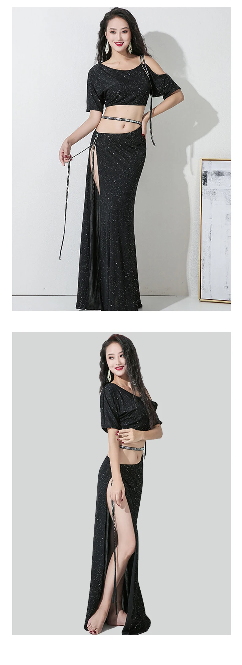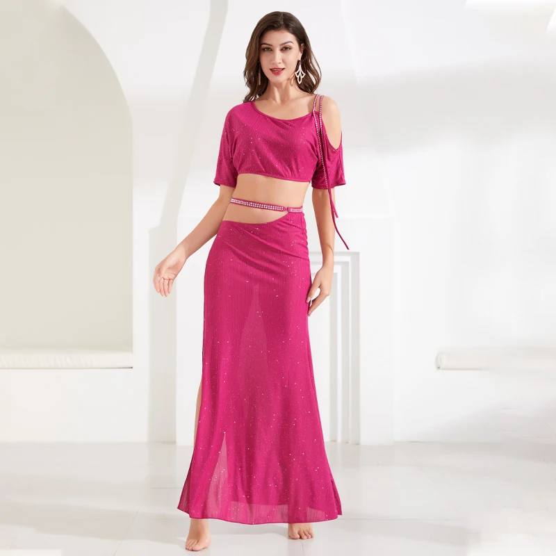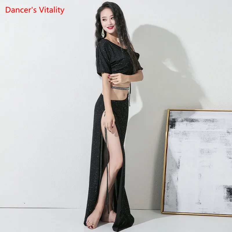 Комплект для танца живота, топ с блестками, с длинным рукавом, юбка с разрезом, тренировочный костюм для женщин и взрослых, высокая талия, одежда для выступлений