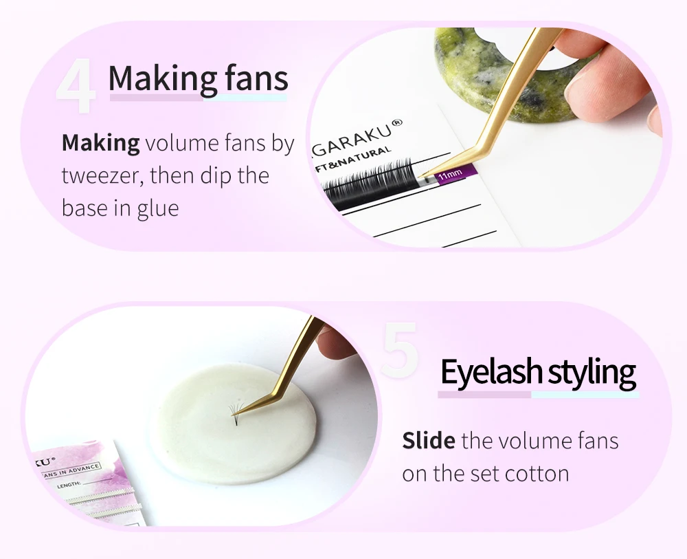 1: Отрежьте полосы: Закрепите шар на 2 двустороннего скотча, и с помощью ножниц cu в соответствующую длину; 2: Отшелушивающий слой ленты: снимите верхний слой ленты пинцетом; 3: пожалуйста, установите хлопок: Возьмите кусок ресницы, хлопковый кусок, и отложите в сторону; 4: изготовление вентиляторов с помощью пинцета, затем окуните основание в клей; 5: Укладка ресниц: нанесите объемные вееры на комплект из хлопка; 6: наборы для хранения объема: мягко Положите ресницы на ленту и храните их для работы.