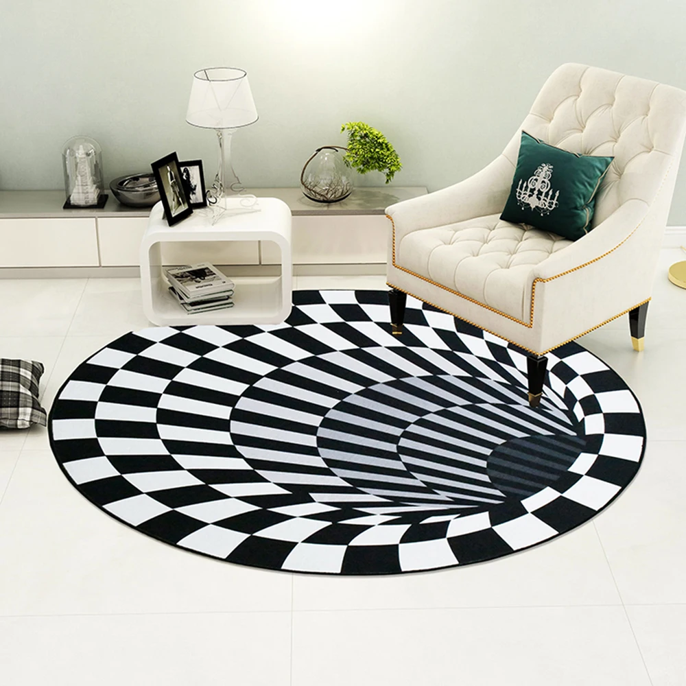 Черный белый клетчатый 3D Круглый ковер, 3D стерео визуальный коврик с отверстиями, нескользящий напольный коврик для домашнего декора гостиной