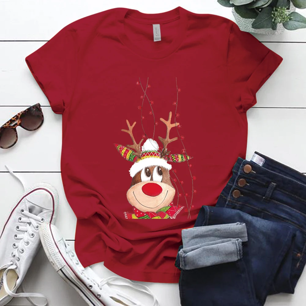 Женская футболка в стиле Харадзюку с коротким рукавом и круглым вырезом, футболка большого размера с принтом рогов на Рождество, Размеры S-xl, Ropa Mujer