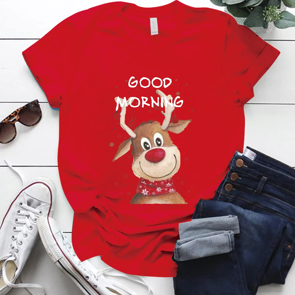 Рождественский олень доброе утро печатные праздничные женские футболки размера плюс S-5xl Забавные милые топы Vogue рождественские футболки для дам