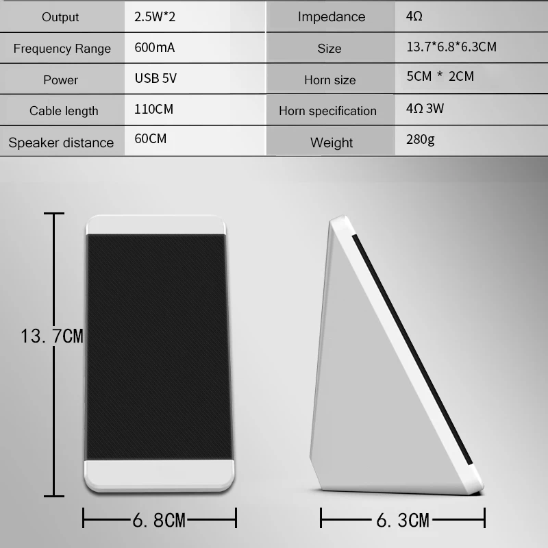 1. Высококачественная проволока: проволока с медным сердечником высокой проводимости для предотвращения плохого контакта, повышения износостойкости и коррозии и более стабильной. 2. Регулировка громкости: Регулировка громкости с регулируемым роликом, удобная и простая в использовании. Высококачественные Звуковые сигналы 3,2x4 Ом 3 Вт: звук мягкий, качество звука чистое. 4. Превосходные материалы: АБС-пластик для литья под давлением, не повреждает динамик. 5. Простой дизайн, простота установки и использования: два динамика можно разместить отдельно 90 см, длина кабеля 130 см.