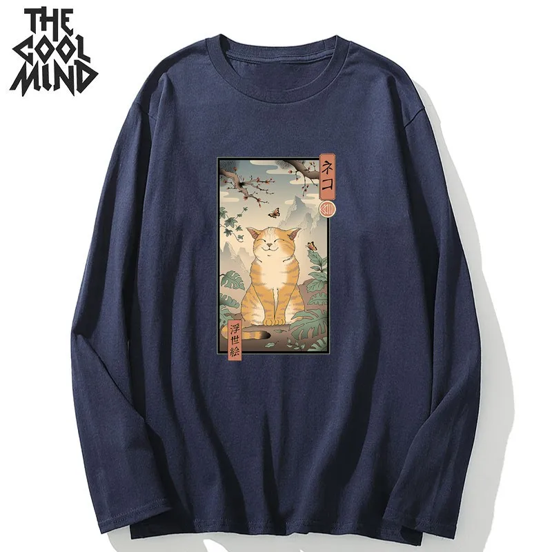 Крутая Мужская футболка COOLMIND из 100% хлопка с длинным рукавом и принтом кошки, Повседневная Свободная Мужская футболка с круглым вырезом, футболка с круглым вырезом для мужчин