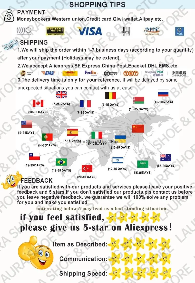О прямых поставках и оптовых продажах:Мы поддерживаем прямые поставки и оптовую продажу. Вы можете легко связаться с нами, мы предложим вам лучшую цену.О дефектах:Из-за различных материалов продукта, методов обработки и партий обработки некоторые детали, такие как стежки, концы ниток, следы клея, небольшой запах, заломы, натуральная текстура кожи, небольшие царапины, этого нельзя избежать и не повлияет на использование. Все это не проблема качества. Мы сделаем все возможное, чтобы избежать изъянов, чтобы предоставить вам более совершенные продукты.О ошибке:Если вы получили неправильную доставку, пропущенную доставку или очевидные проблемы с качеством, чтобы обеспечить ваши права, пожалуйста, сделайте фото лицевой и нижней листов посылка, опишите конкретную проблему продукта и своевременно свяжитесь со службой поддержки клиентов. Мы организуем повторную отправку или возврат средств.О тарифах:В соответствии с правилами национальной таможни вашей страны, таможенные пошлины могут взиматься на товары, импортируемые из-за рубежа. Если вы получили таможенное смс или уведомление по электронной почте об оплате налога, пожалуйста, своевременно свяжитесь со службой поддержки клиентов и оплатите таможенные пошлины.О возврате и возмещении:Если вы хотите вернуть или обменять товар, пожалуйста, свяжитесь с нами в течение 7 дней после получения обуви (на основании даты знака логистики). Товар должен быть в исходном состоянии (стоимость доставки и обработки не возвращается). Дефекты, Сделанные Человеком, не гарантируются, например, поломки, царапины и т. Д.О счете:Мы не вкладываем в посылку счет-фактуру. Если вам нужно оформить счет-фактуру, пожалуйста, свяжитесь с нашей службой поддержки клиентов, чтобы предоставить соответствующую информацию о фактуре.