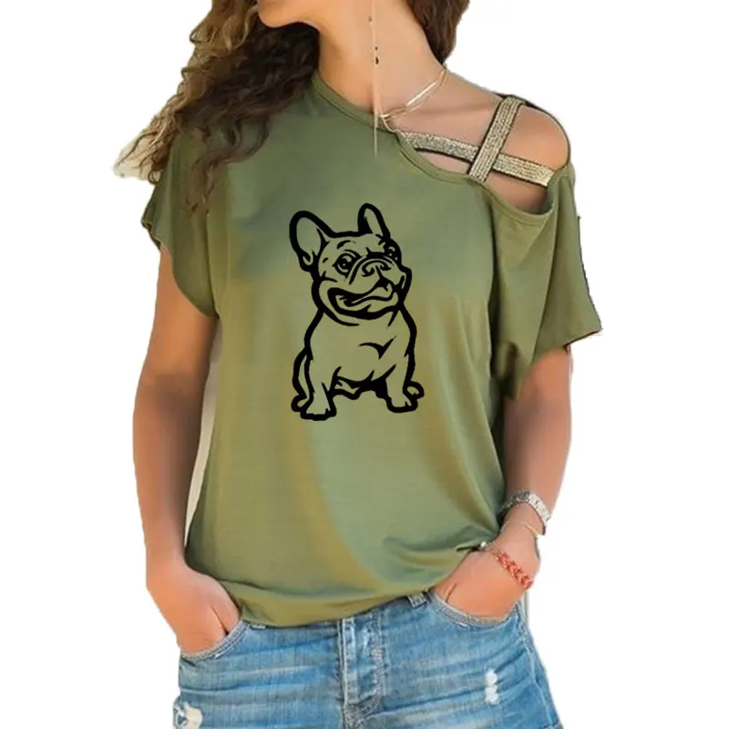 Футболка женская с принтом французского бульдога, топ с коротким рукавом, ассиметричная бандажная рубашка с перекрещивающимися полосками, одежда для девушек