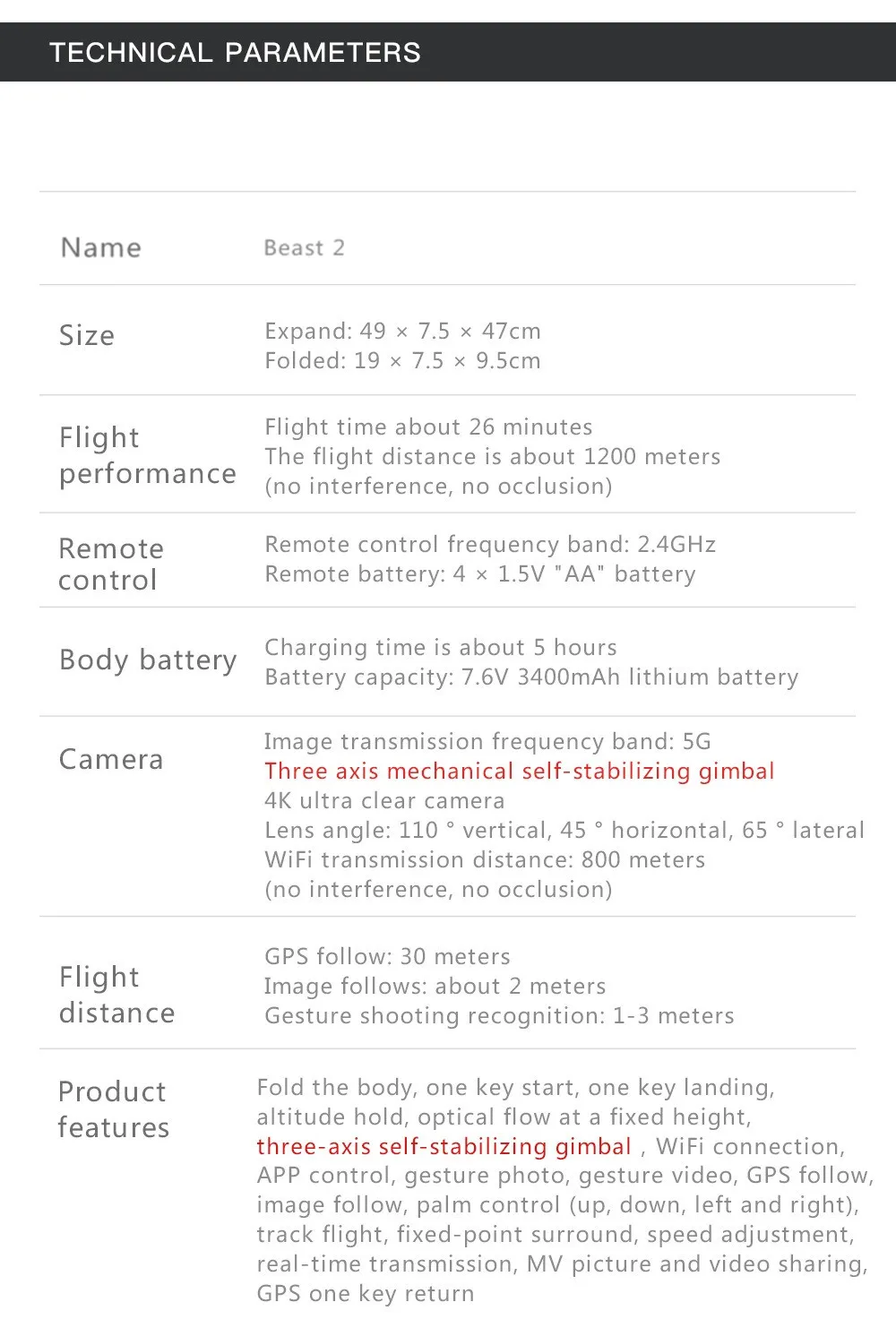 Функция: складной, запуск одной кнопкой, посадка одной кнопкой, удержание высоты, двойная камера, Wi-Fi подключение, управление приложением, фото жестов, запись жестов, Inteiiigent IPP следующий, GPS следующий за мной режим, palmконтроль (вверх вниз влево вправо), полёт точки пути, точки интерес, контроль скорости, передача в режиме реального времени, MV изображения и видео обмена, GPS возврата домой, 4K HD регулируемая камера, Безголовый режим, оптический режим позиционирования потока, объемный полет, траектория наведения полета,