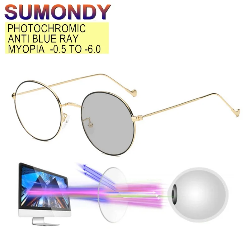 SUMONDY Анти Blue Ray фотохромные Рецептурные очки для близоруких-0,5 до-6,0 Для женщин мужчины в круглой оправе очки для близоруких UF44