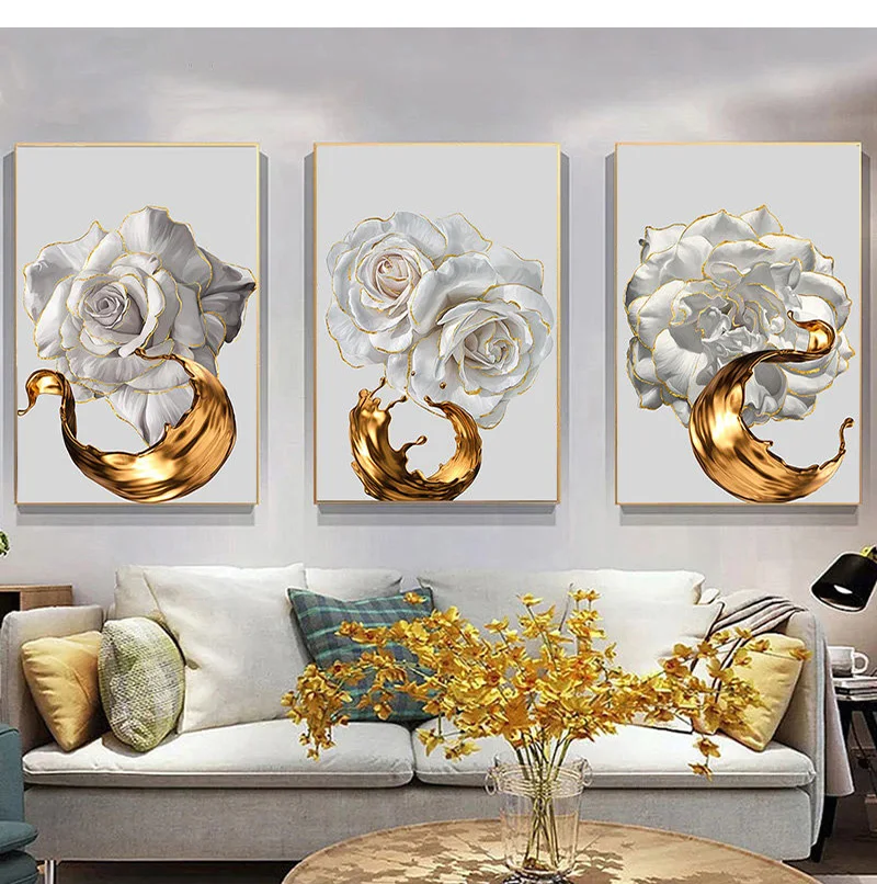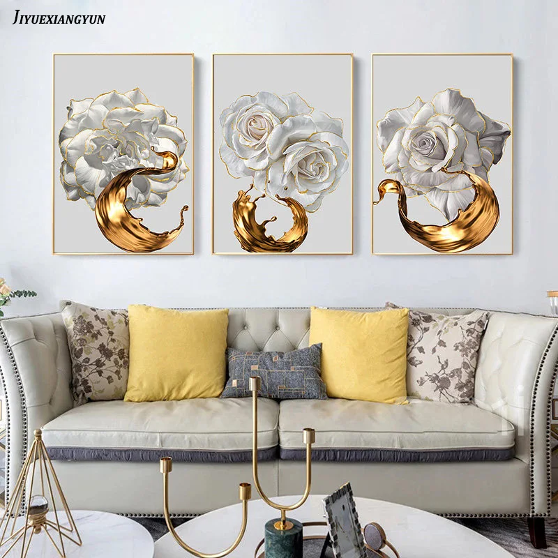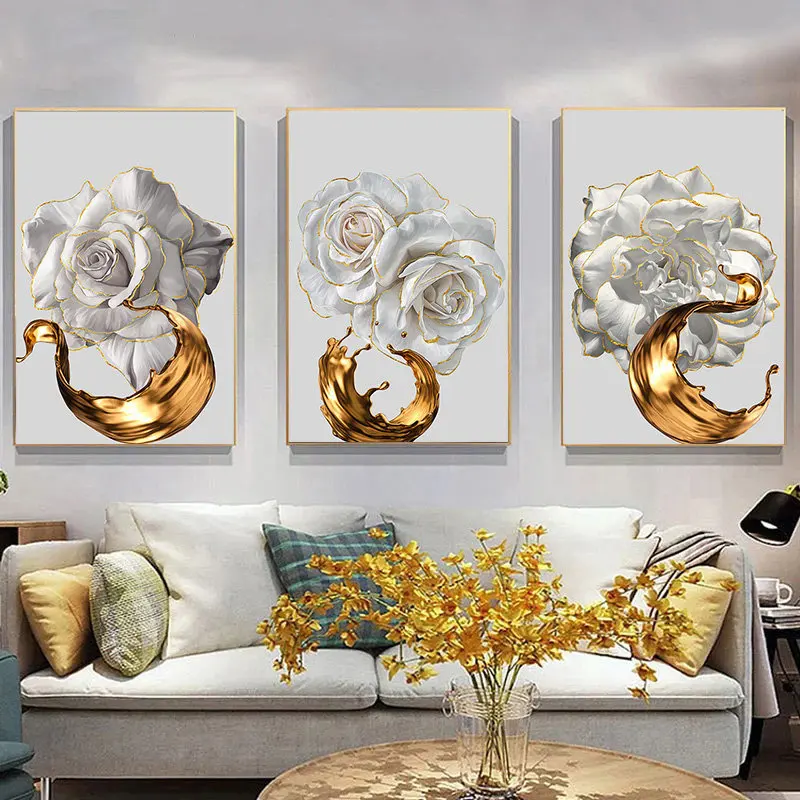 Белая роза золотой Жемчужный Цветок Золотой Фон абстрактная живопись плакат Nordic искусство Завод холст Современная картина стены для домашнего декора