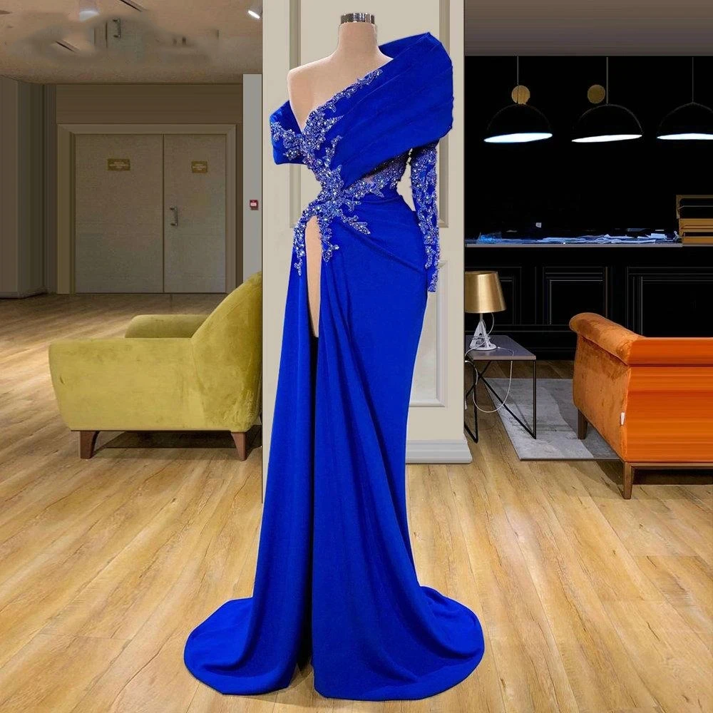 Блестящие Ярко-синего цвета одежда с длинным рукавом Русалка Арабский вечернее платье из бисера Кружева Аппликации размера плюс платья для выпускного бала; ЖЕНСКИЕ НАРЯДНЫЕ ПЛАТЬЯ