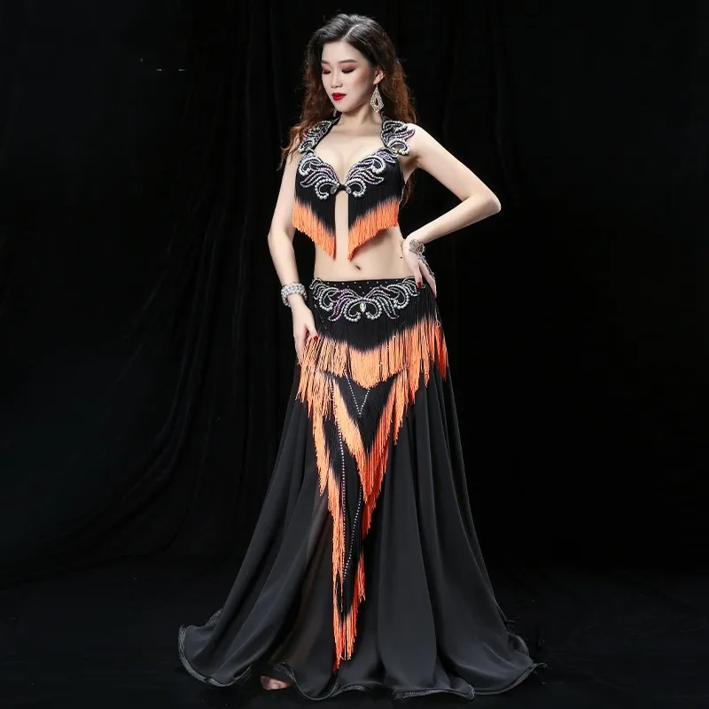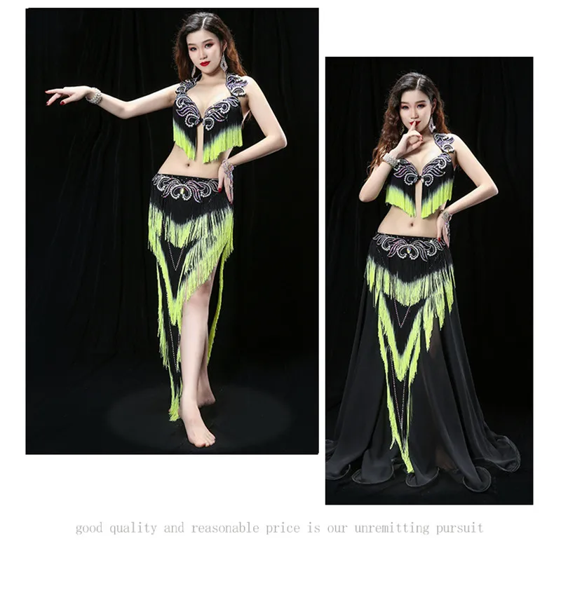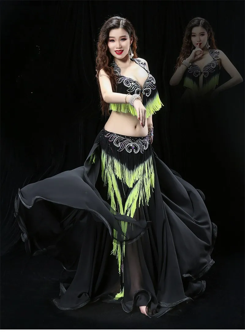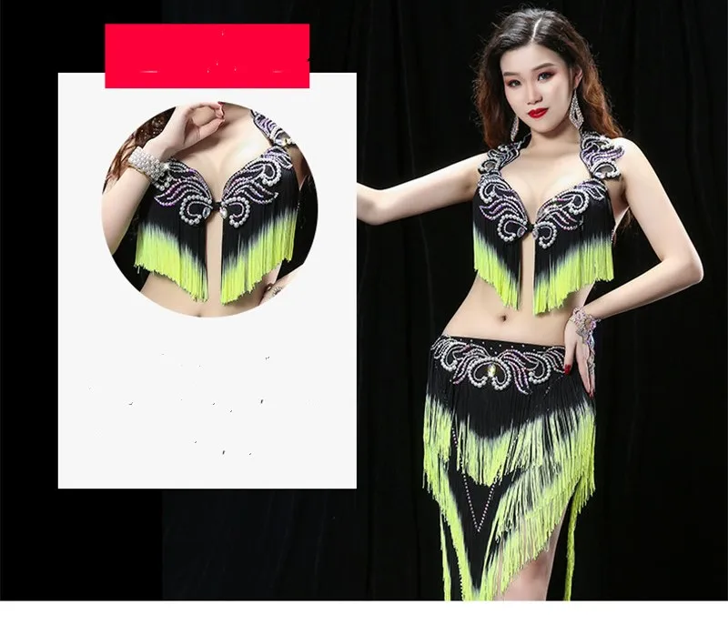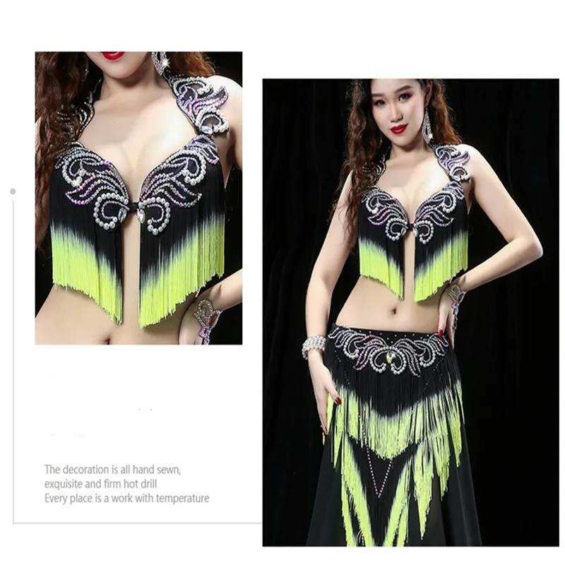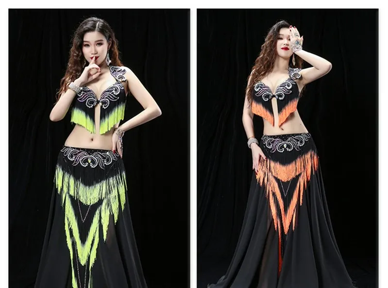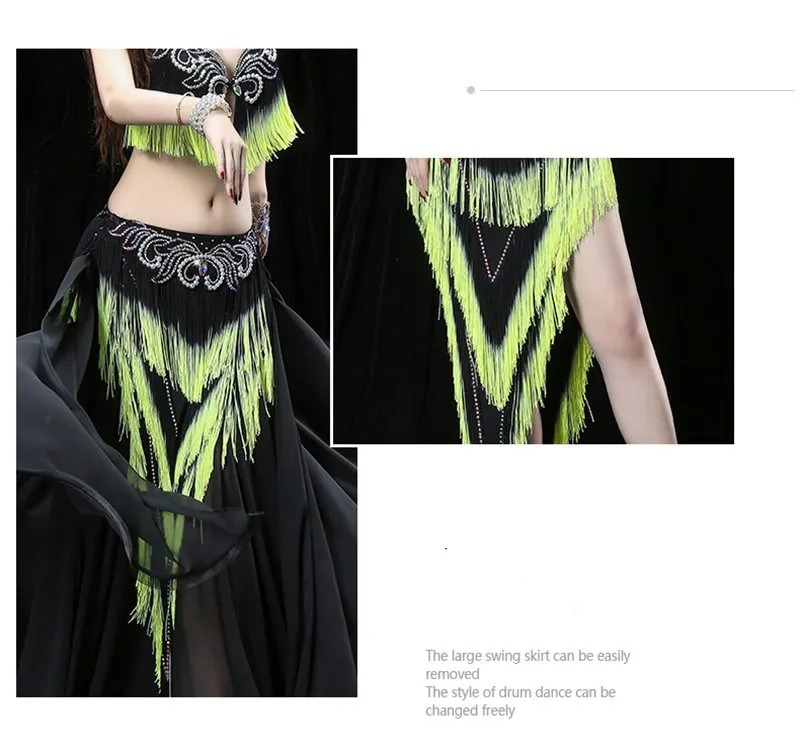 Женский костюм для танца живота с тяжелой кисточкой, костюм для восточных танцев барабана, бюстгальтер, юбка для соревнований, юбка контрастных цветов