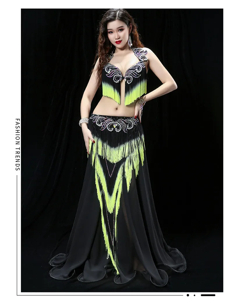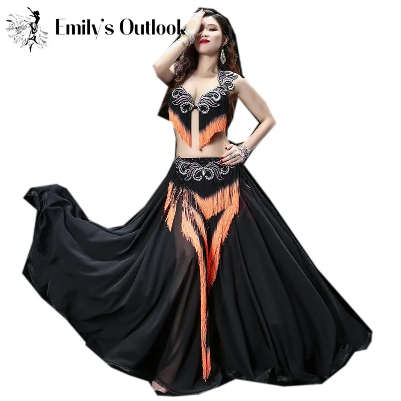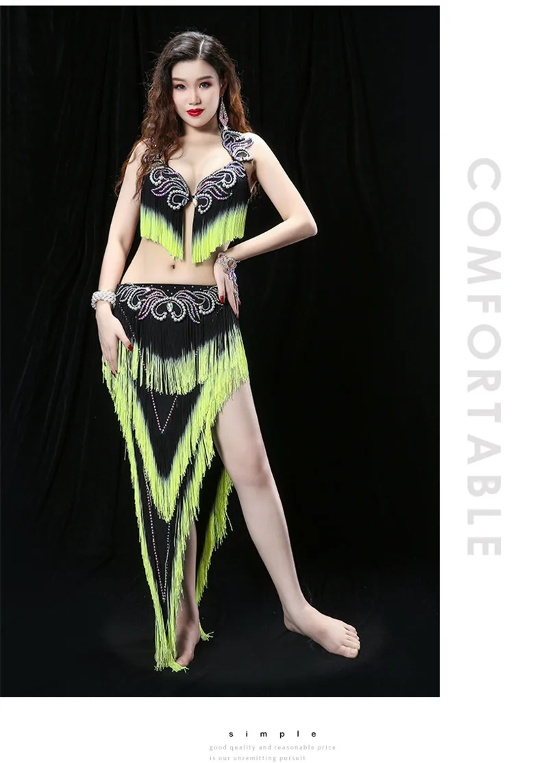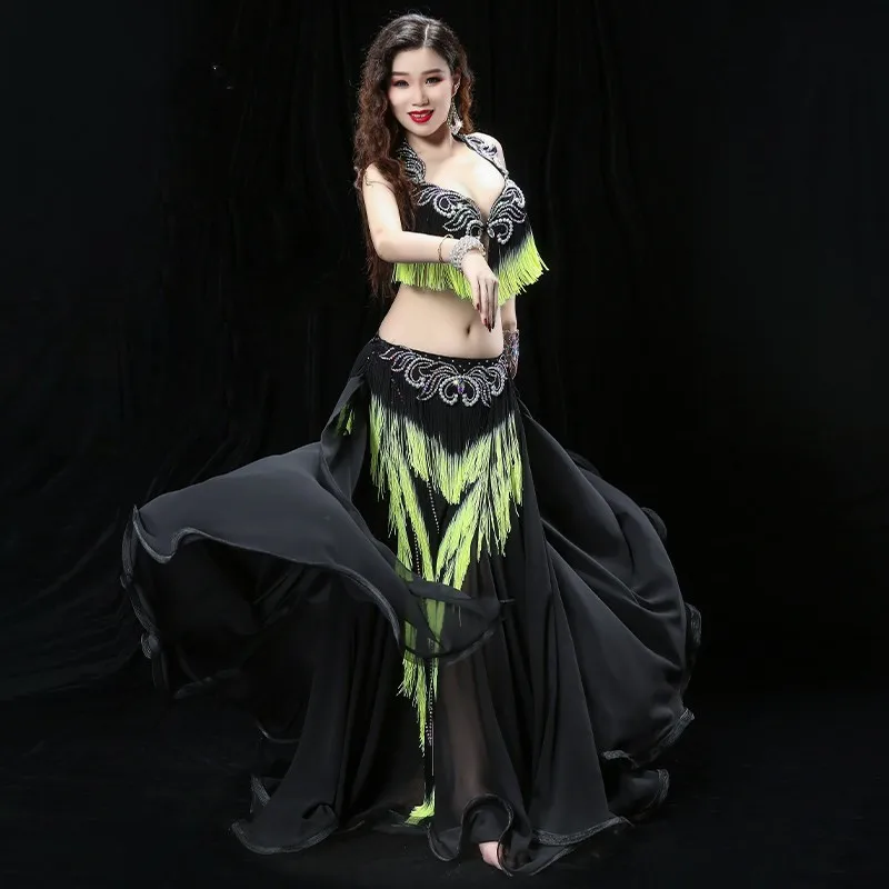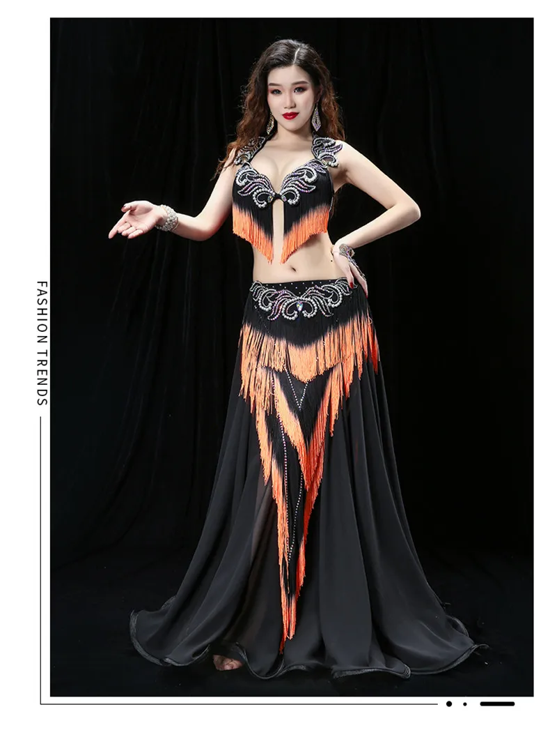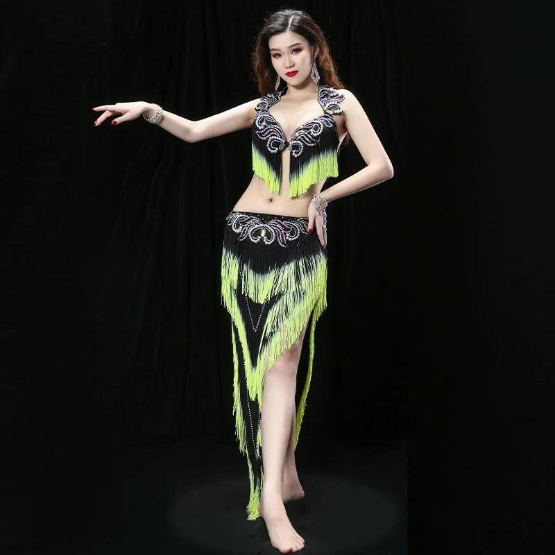 Женский костюм для танца живота с тяжелой кисточкой, костюм для восточных танцев барабана, бюстгальтер, юбка для соревнований, юбка контрастных цветов
