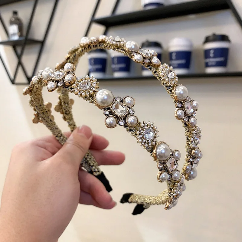 Повязка на голову в стиле барокко для женщин, лента с камнями, жемчужинами и кристаллами, аксессуары для волос в корейском ретро стиле, винтажная корона, оптовая продажа, Прямая поставка