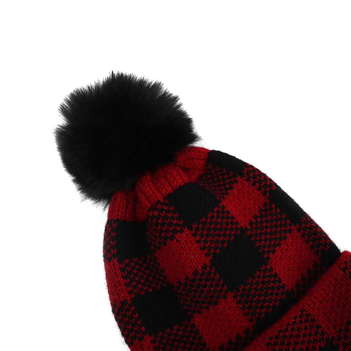 Зимняя теплая шапка для родителей и детей, Вязаная Шапка-бини в клетку с помпоном из искусственного меха для взрослых и детей