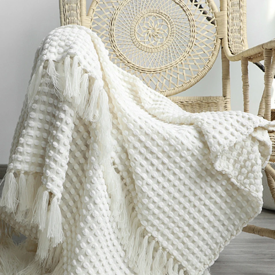 Белое вязаное одеяло с кисточками для дивана, скандинавский плед с ...