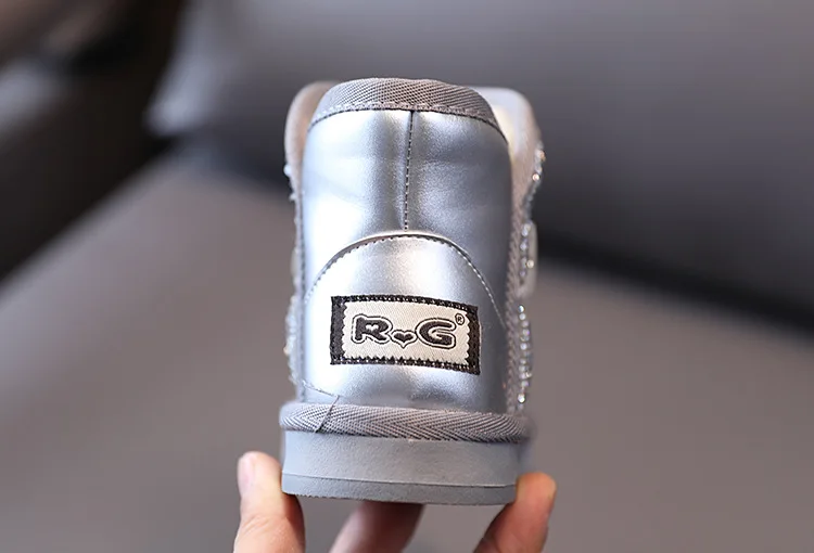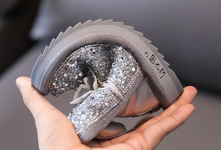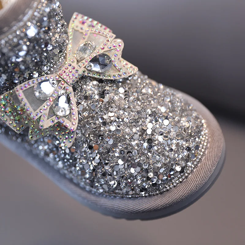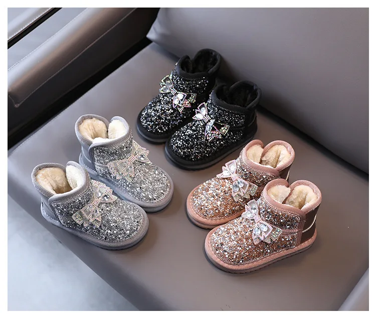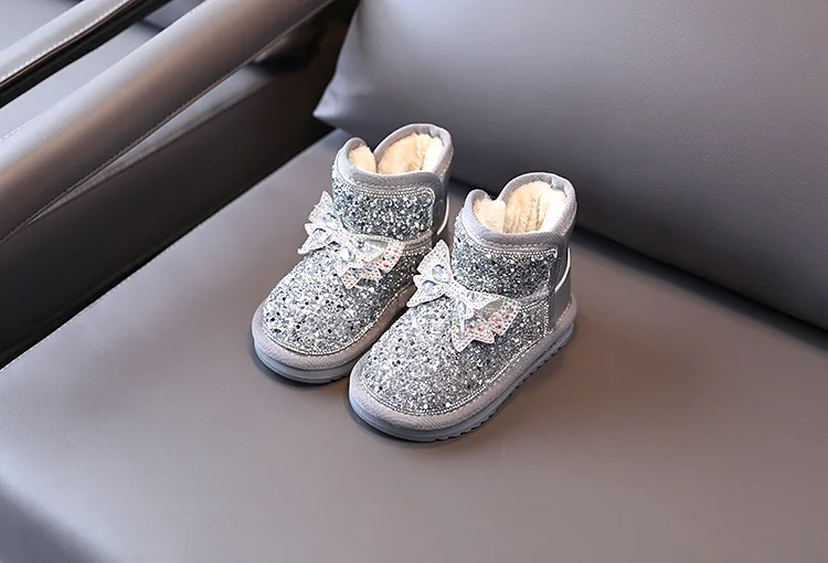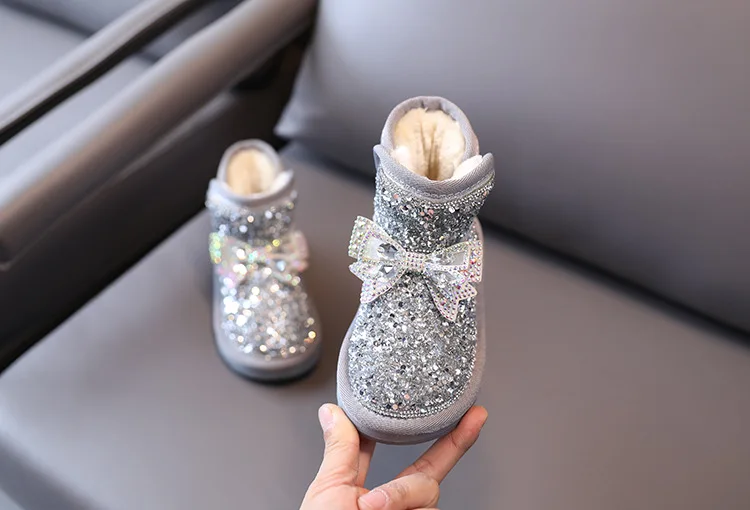 Зимние детские ботинки для снежной погоды, брендовая детская обувь с бантом, ботильоны для маленьких девочек, серебристая обувь для малышей со стразами, теплые ботинки принцессы, Новинка
