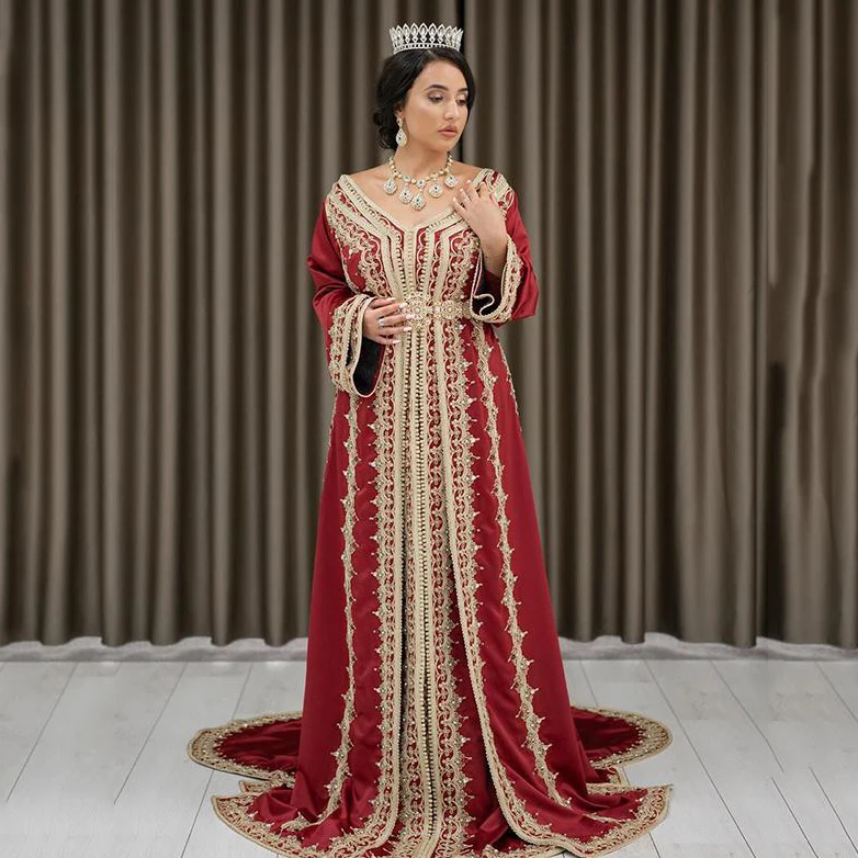 Красный марокканский кафтан с бисером и вышивкой с длинным рукавом ...