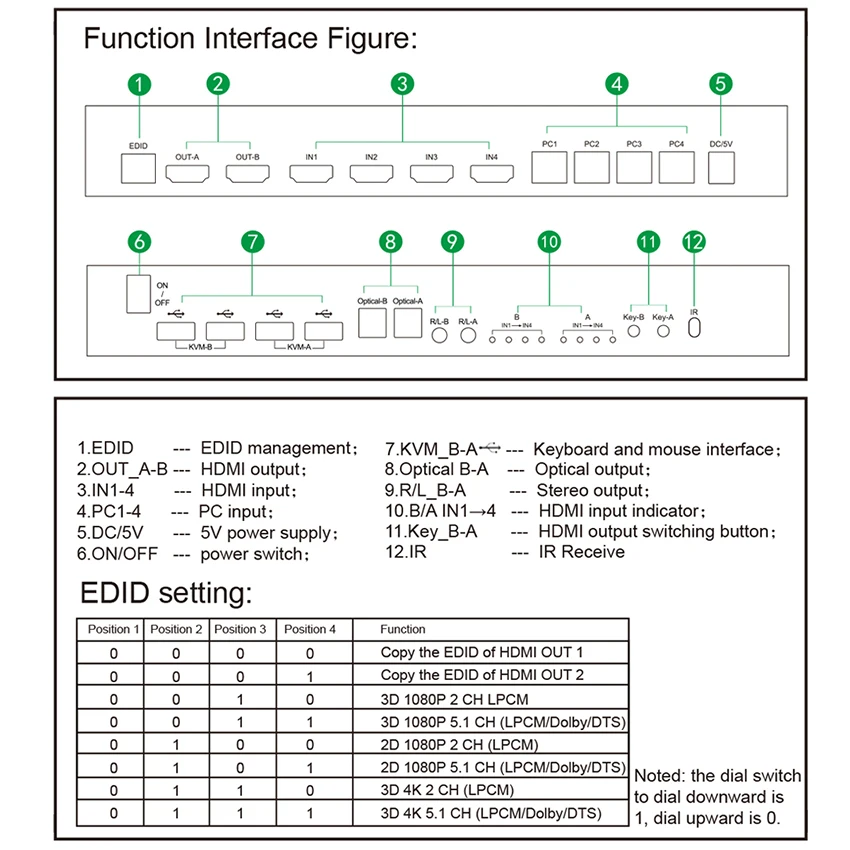 Версия HDMI: HDMI2.0 (обратная совместимость) Версия HDCP: HDCP 2,2 (обратная совместимость) Разрешение: до 3840x/60 Гц (RGB/YUV 4:4:4) (обратная совместимость) Поддержка формата 3D видео Поддержка аудиоформатов: LPCM/DTS 5,1/Dolby Поддержка формата видео: Глубина цвета 8/10/12 бит Максимальная пропускная способность передачи: 600 МГц Максимальная скорость передачи: 3x6 Гбит/с Входные порты HDMI: 4 Выходной порт HDMI: 2 Поддержка 4K (вход) в 2K (выход) (уменьшение) Поддержка 2 HDMI извлечение аудиосигнала, независимый аудиовыход через оптический SPDIF или аудиоразъем 3,5 мм. Четыре сигнальных входа HDMI переключаются или распределяются на два дисплея HDMI. Поддержка 3 методов переключения: переключатель клавиш, переключатель дистанционного управления, переключатель клавиатуры.