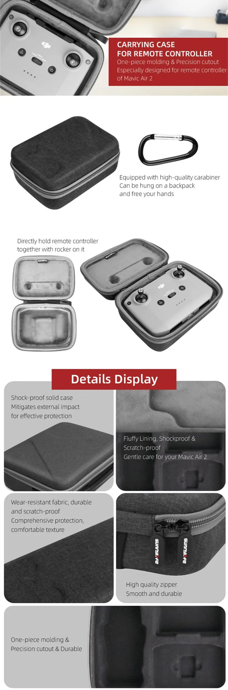 Цельное формование и точный вырез Специально разработан для пульта дистанционного управления Mavic Air 2 Оснащен высоким-качественный карабин Можно повесить на рюкзак и освободить руки Удерживайте пульт дистанционного управления вместе с качанием на нем Подробный дисплей Ударопрочный Твердый Чехол Смягчает внешнее воздействие для эффективной защиты Пышная подкладка, Ударопрочная и устойчивая к царапинам Бережный уход за вашим Mavic Air 2 Износостойкая ткань, прочная и устойчивая к царапинам Комплексная защита, удобная текстура Высококачественная молния, гладкая и прочная Цельное формование, точный вырез и прочность