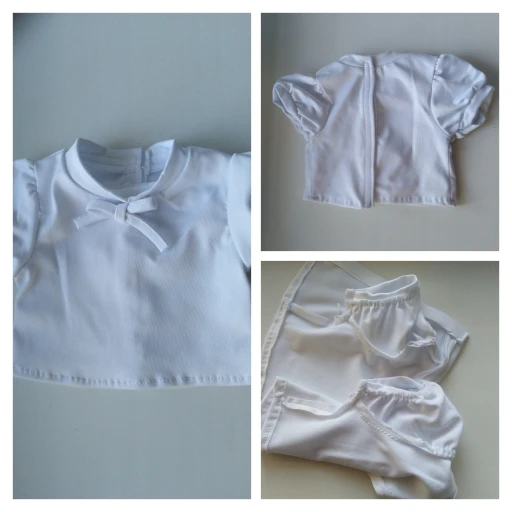 Костюмчик симпатичный. Ткань на штанишках не тянется, поэтому не получилось надеть на куклу 55 см ростом, застряли в манжетах на коленках (ножки выше колена 15 см в обхвате). Кофточка тянется хорошо, но ворот немного широковат даже на обхват шеи 14 см. Швы не обработаны. К покупке советую, но смотрите по размеру своей куклы. С продавцом не общалась.