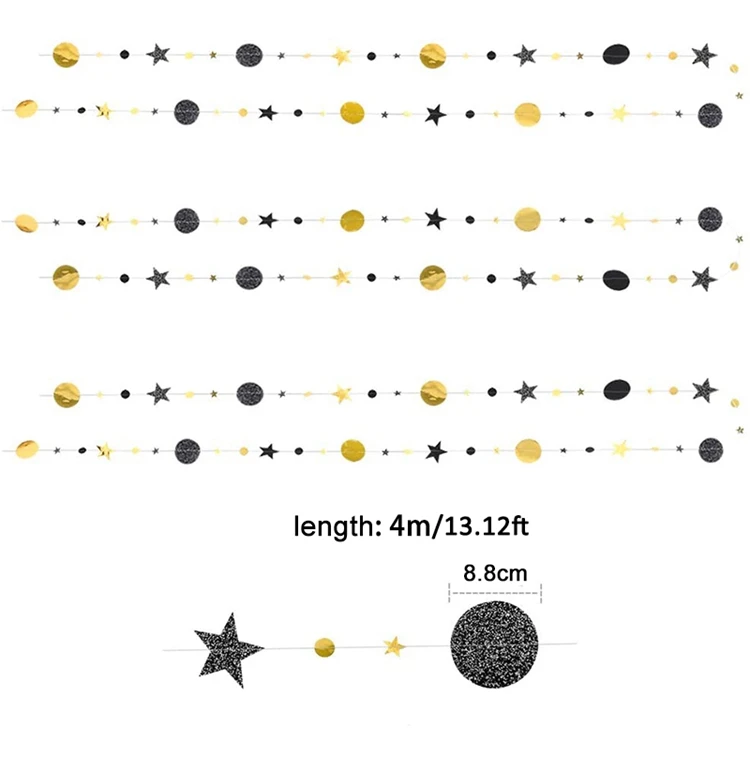 Длина: 4 метра/13,12 футаМатериал: блестящая бумажная картаПовод: отлично подходит для нового года, дня рождения, выпускного и других праздвечерние чных украшений.