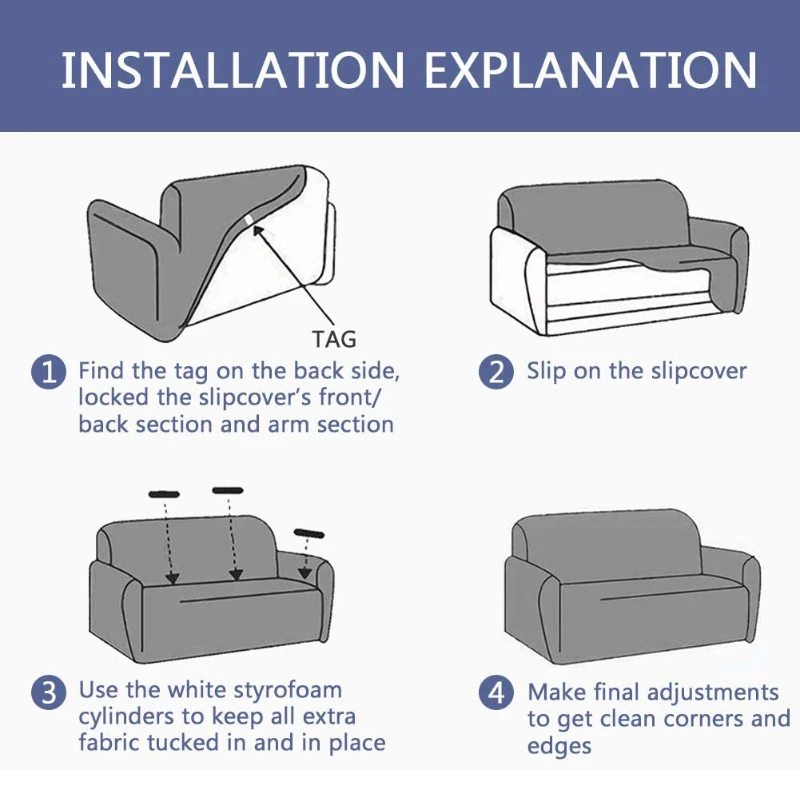 Чехол для дивана как установить? Шаги 1: Поместите чехол на диван с этикеткой на задней части 2: Потяните ткань равномерно над диванной и надавите белые губчатые цилиндры между подушечками, прикрепляйте крышку к дивану и удерживайте ткань плотно шагами 3: Наклоните диван вверх и найдите галстуки на резинке. Плотно затяните переднюю и заднюю завязки и завяжите. Вытяните боковые стяжки вместе и плотно выполните шаги 4: Положите диван вниз и плотно наденьте крышку pll, потянув любую излишки ткани на заднюю часть 5: Наслаждайтесь новым скрытым диваном!