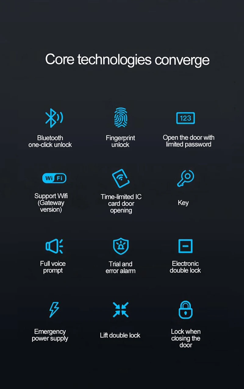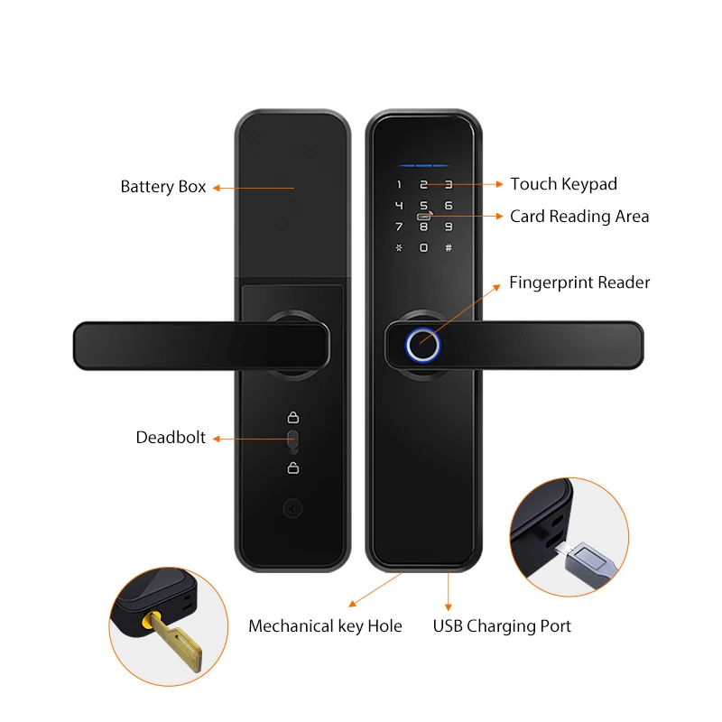Материал: алюминиевый сплавДоступные цвета: атласный никель, черный никельМетод разблокировки: приложение Tuya, IC карта, пароль, отпечаток пальца, ключНазвание приложения: приложение tuya smart lifeСистема поддержки: IOS7.0 или Android 4,4 или вышеСрок службы батарей: 10000 раз нормальное открытие (год)
