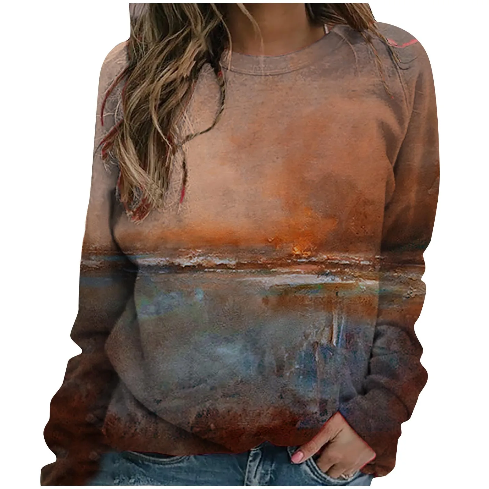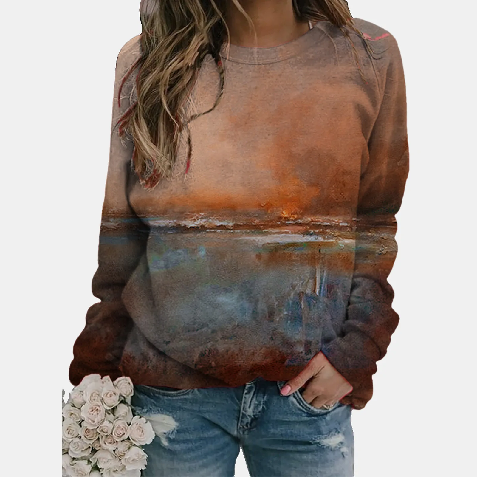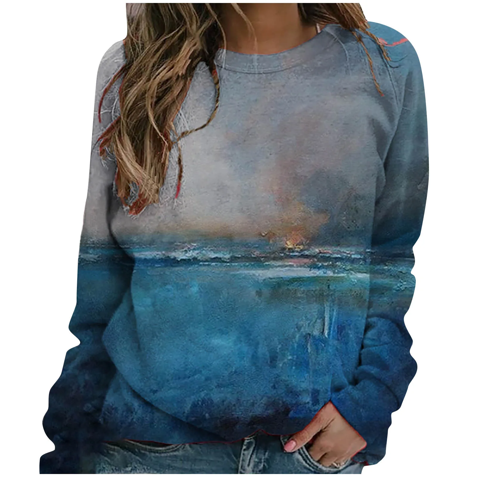 Женская мода Пейзаж печати o-образным вырезом с длинными рукавами Повседневные свободные топы блузка