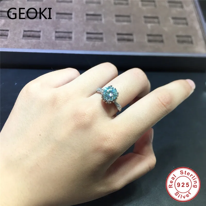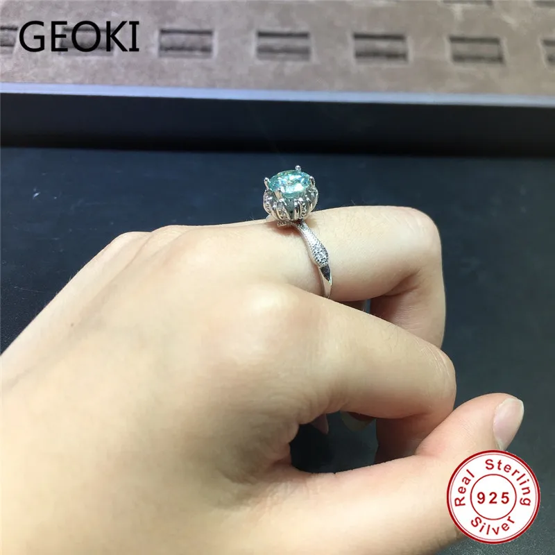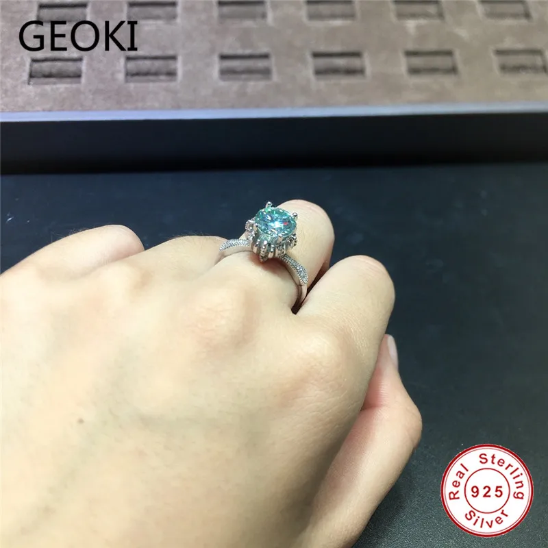 Geoki прошел алмаз Тесты 1 карат голубой зеленый VVS1 Муассанит c бутоном цветка в форме кольца 925 пробы серебро, изумруд кольца для Для женщин