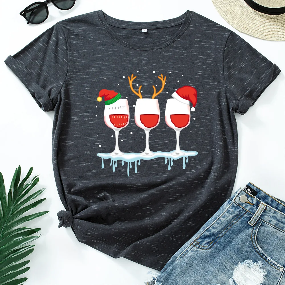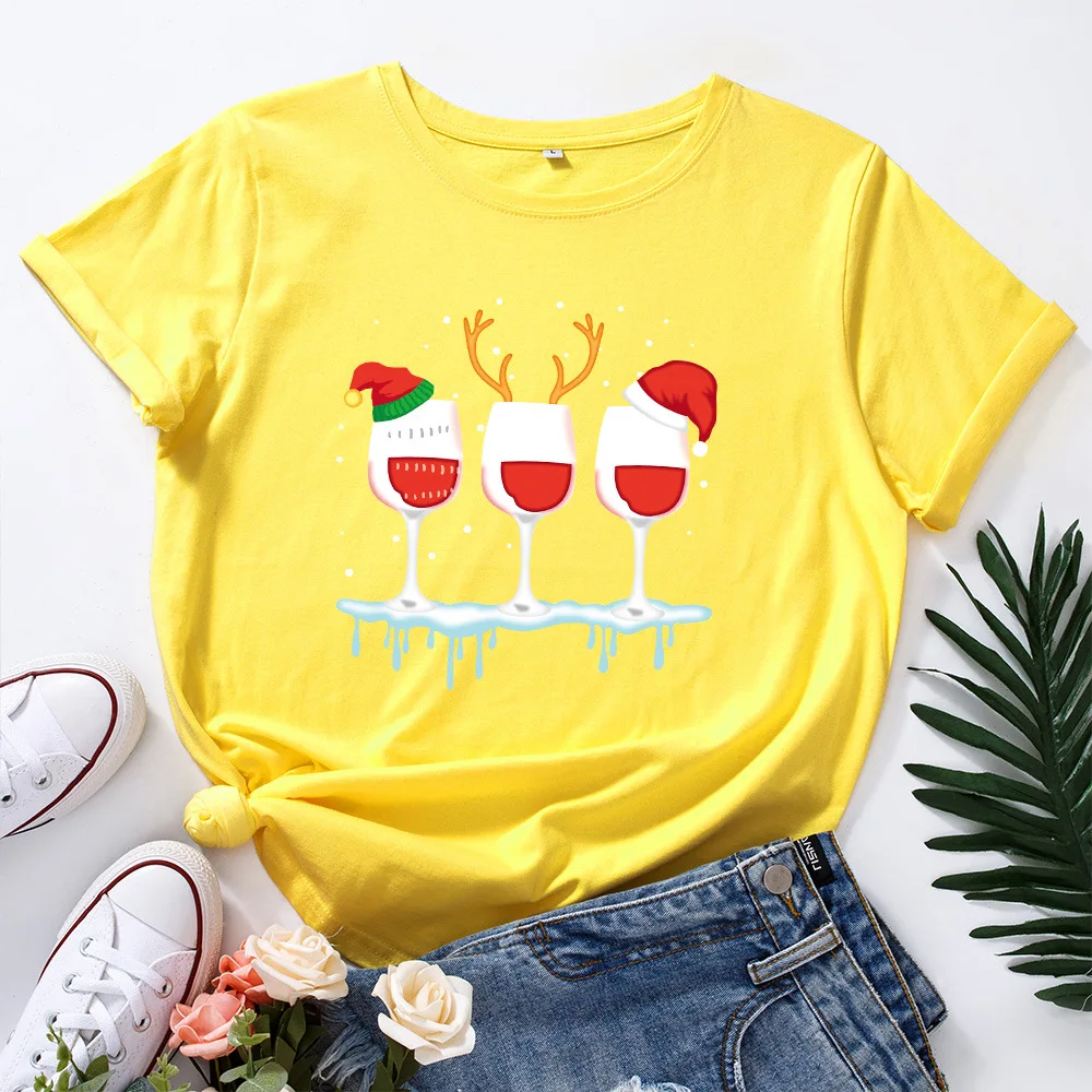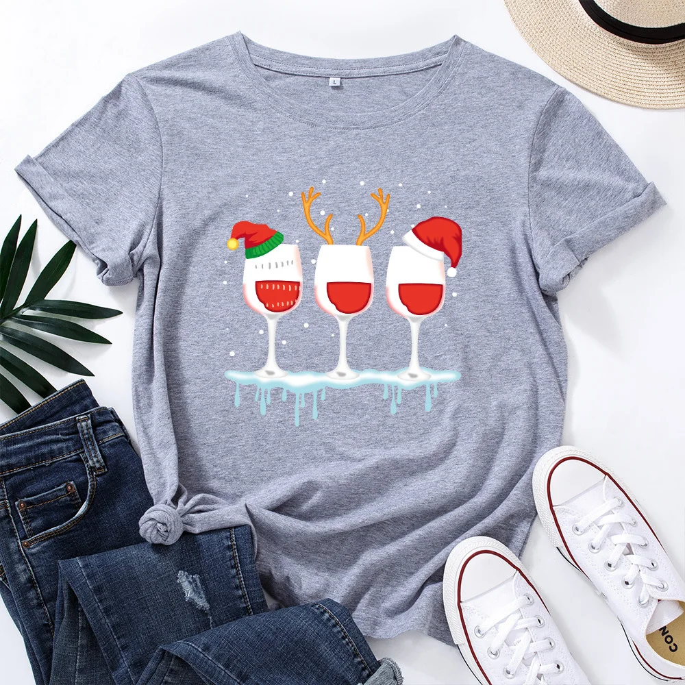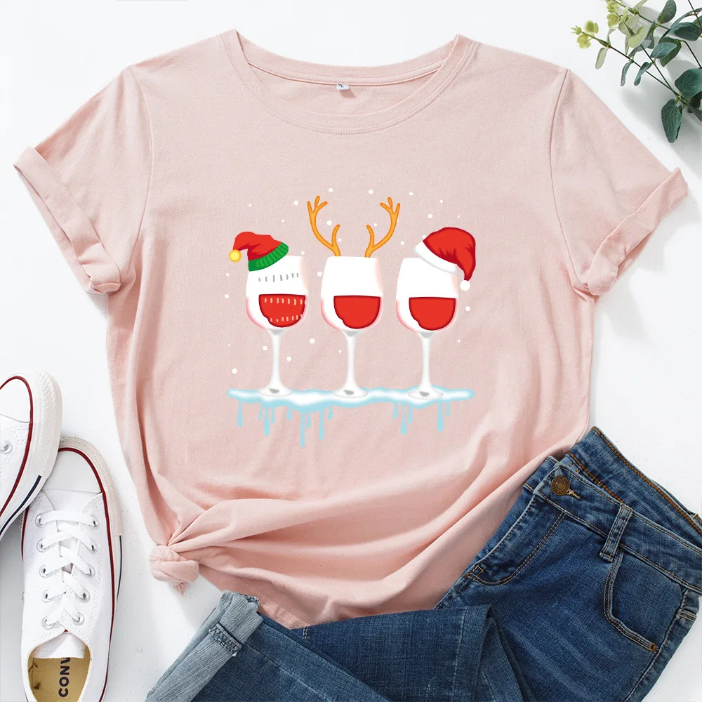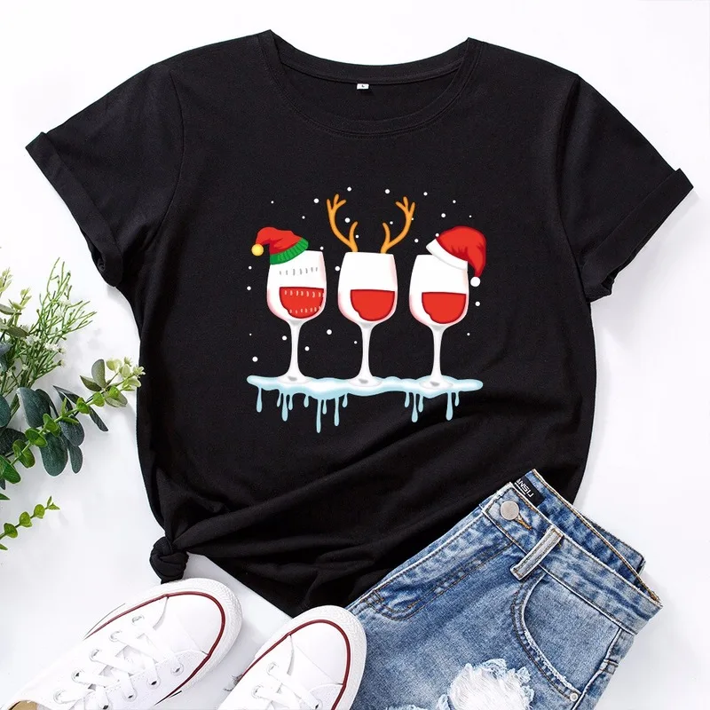 Модная Летняя женская футболка большого размера d, хлопковая Рождественская шляпа, бокал, винный принт, размера плюс размер 5XL, повседневные футболки с круглым вырезом и короткими рукавами