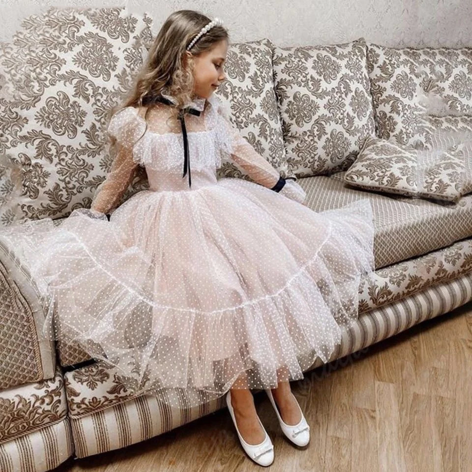 Белое Тюлевое платье принцессы с жемчугом, платья с длинным рукавом...