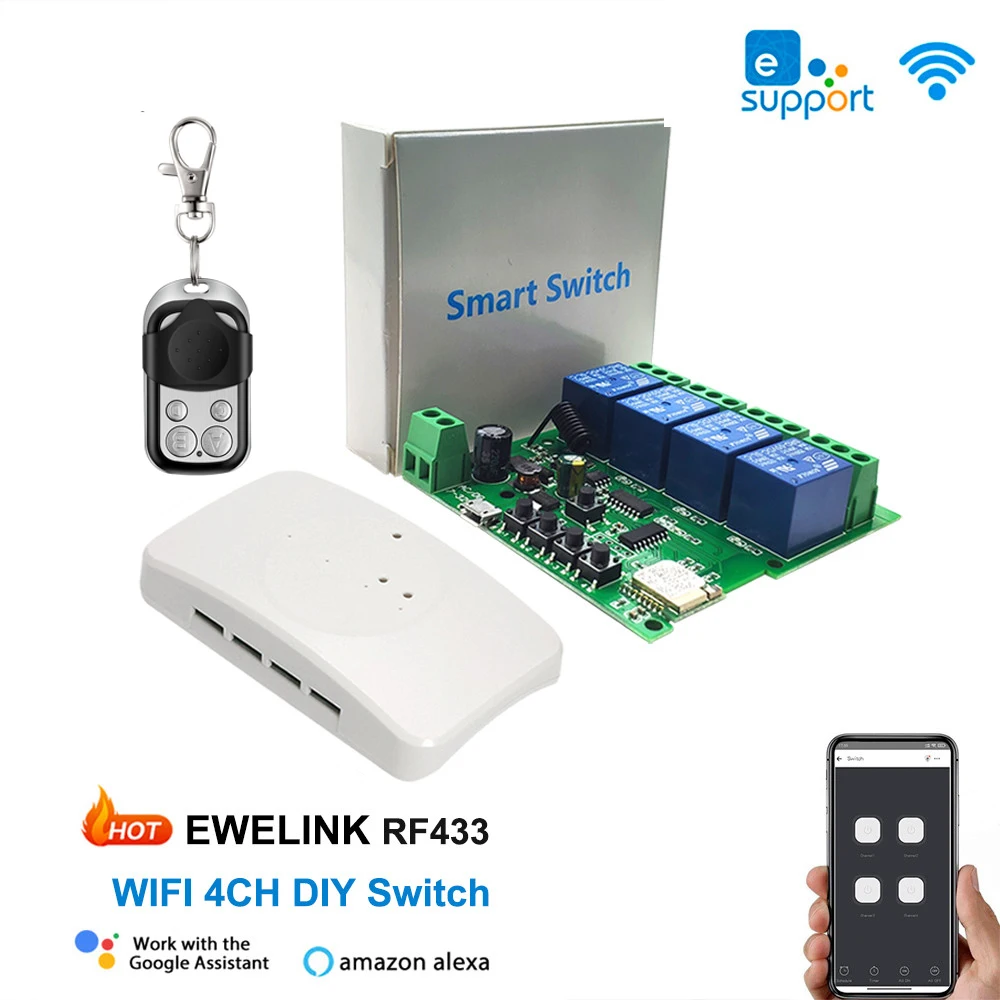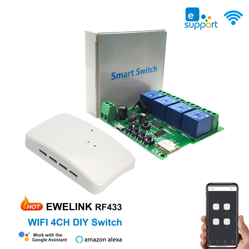 4-канальный модуль переключателя EWELINK с Wi-Fi, дистанционное управление через приложение, 12 В, 220 В, радиочастотный приемник, 10 А, сделай сам, умное 4-канальное реле, работает с Alexa Google Home